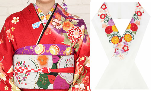 そして、長襦袢には半衿を縫い付けます。この写真では白い無地の半衿がついていますが、振袖では華やかな着こなしの楽しみとして刺繍の半衿や色の半衿をぜひご着用ください!