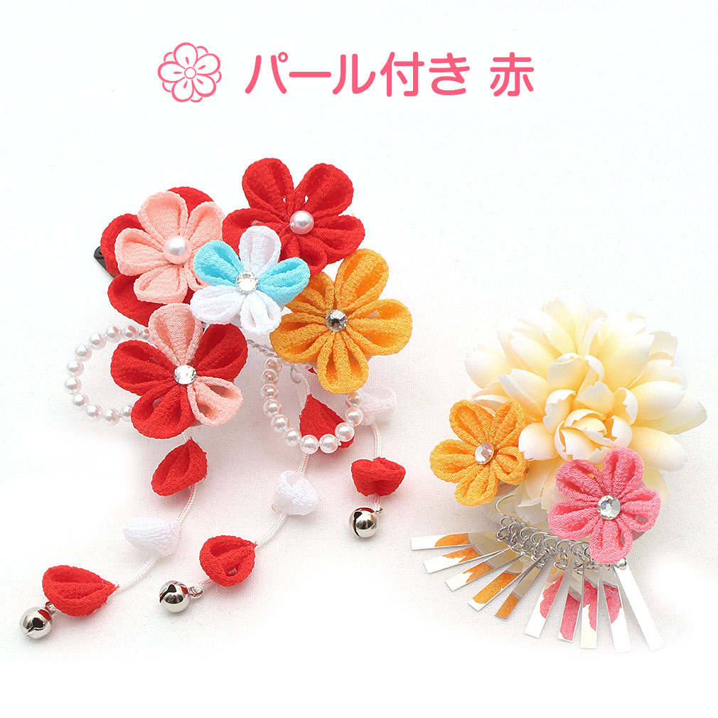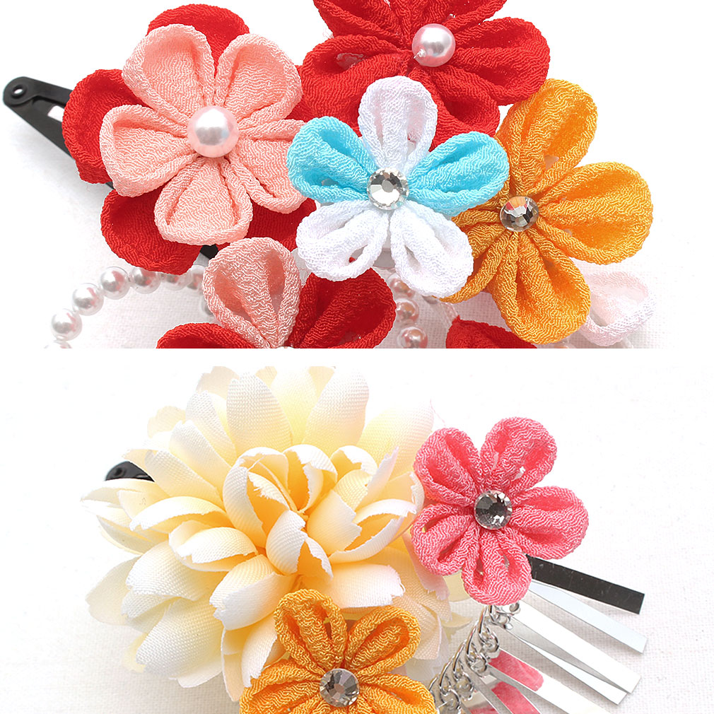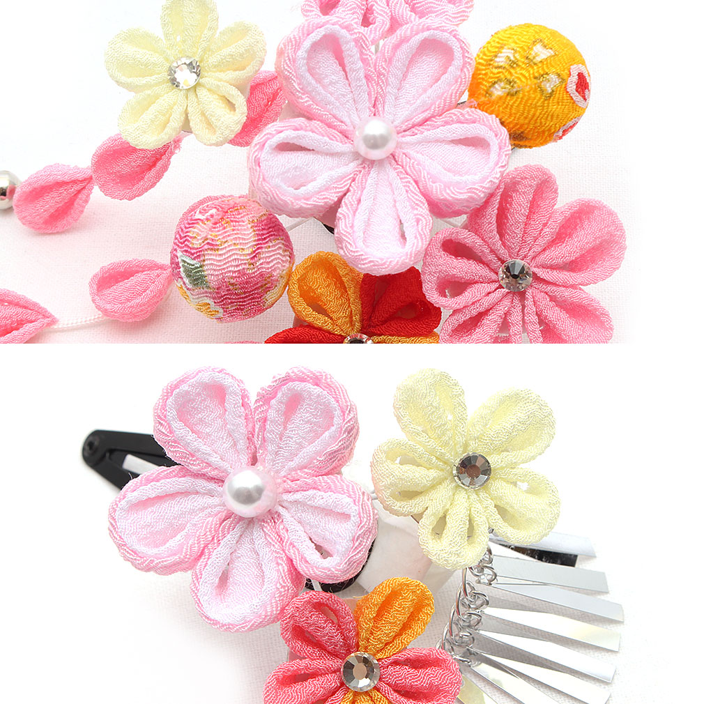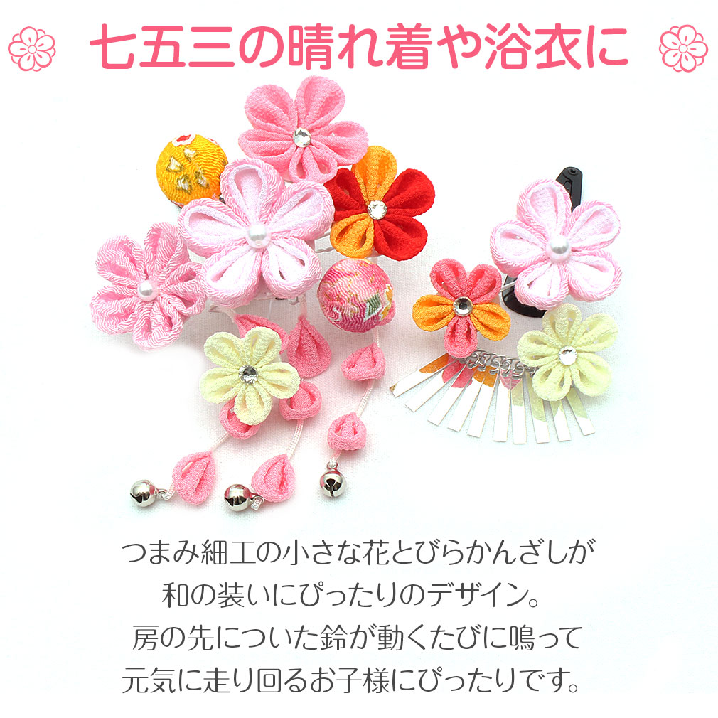 ぷっくらとしたお花のつまみ飾りが可愛らしい髪飾り2点セットです。 房の先には鈴が付いており、ゆらゆらと揺れて音が鳴る姿は何ともキュート。 留め具はパッチン留めタイプのため、量が少なめなお子様も付けられます。 七五三や桃の節句、お正月などの晴れ着姿にあわせてお使い頂ける髪飾りです。