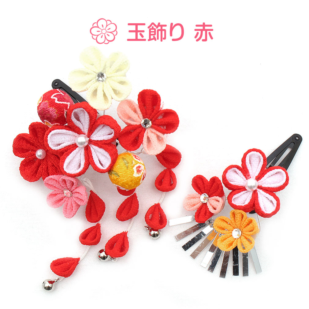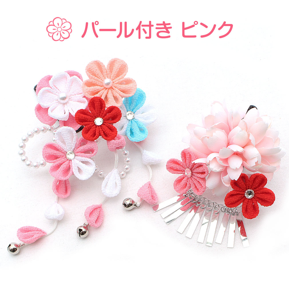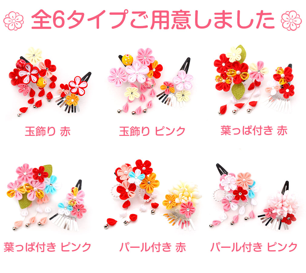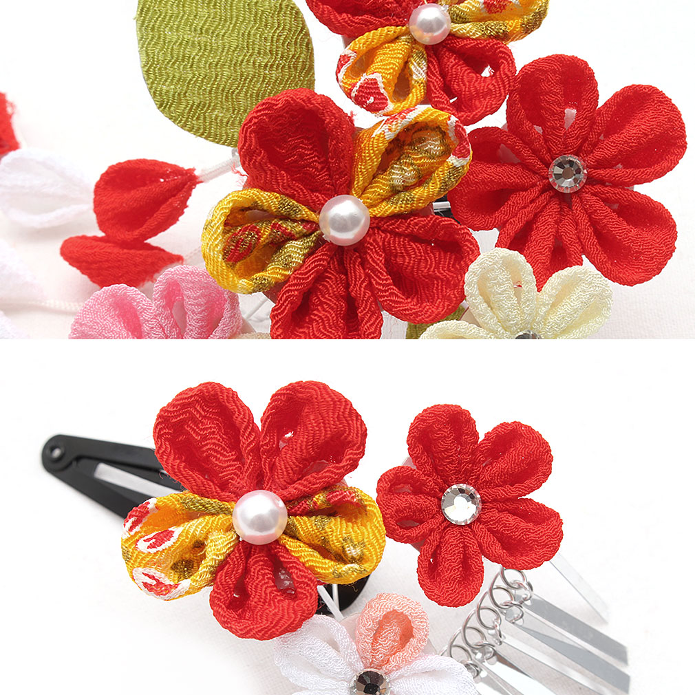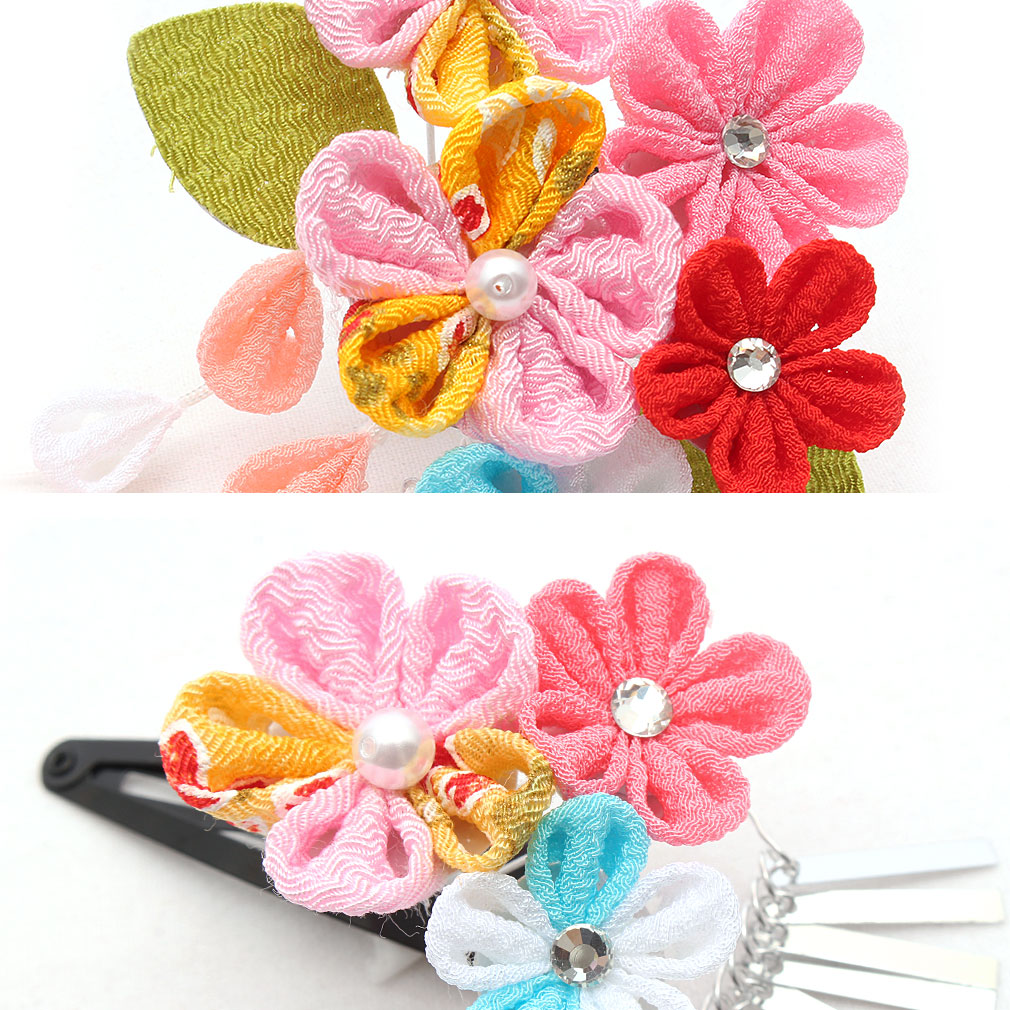 ぷっくらとしたお花のつまみ飾りが可愛らしい髪飾り2点セットです。 房の先には鈴が付いており、ゆらゆらと揺れて音が鳴る姿は何ともキュート。 留め具はパッチン留めタイプのため、量が少なめなお子様も付けられます。 七五三や桃の節句、お正月などの晴れ着姿にあわせてお使い頂ける髪飾りです。