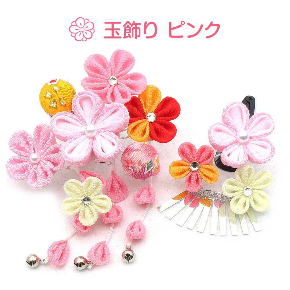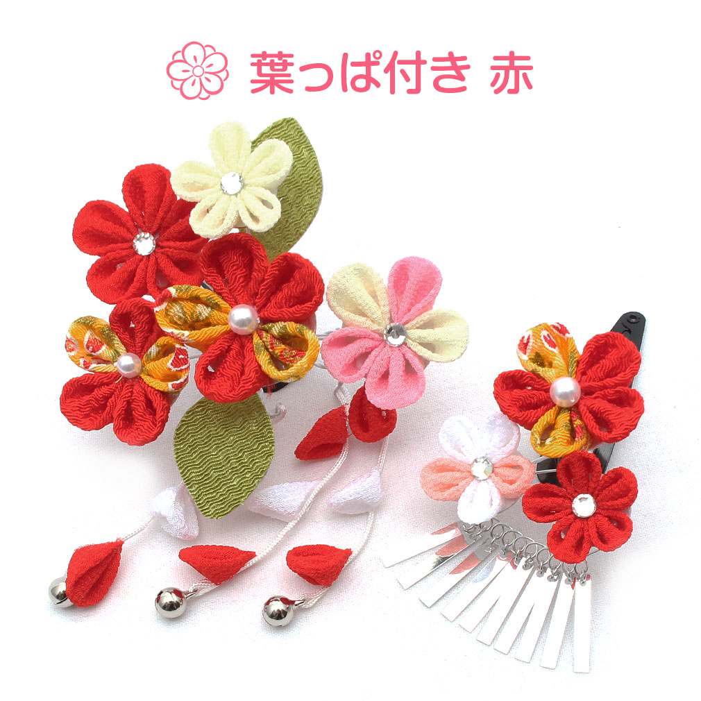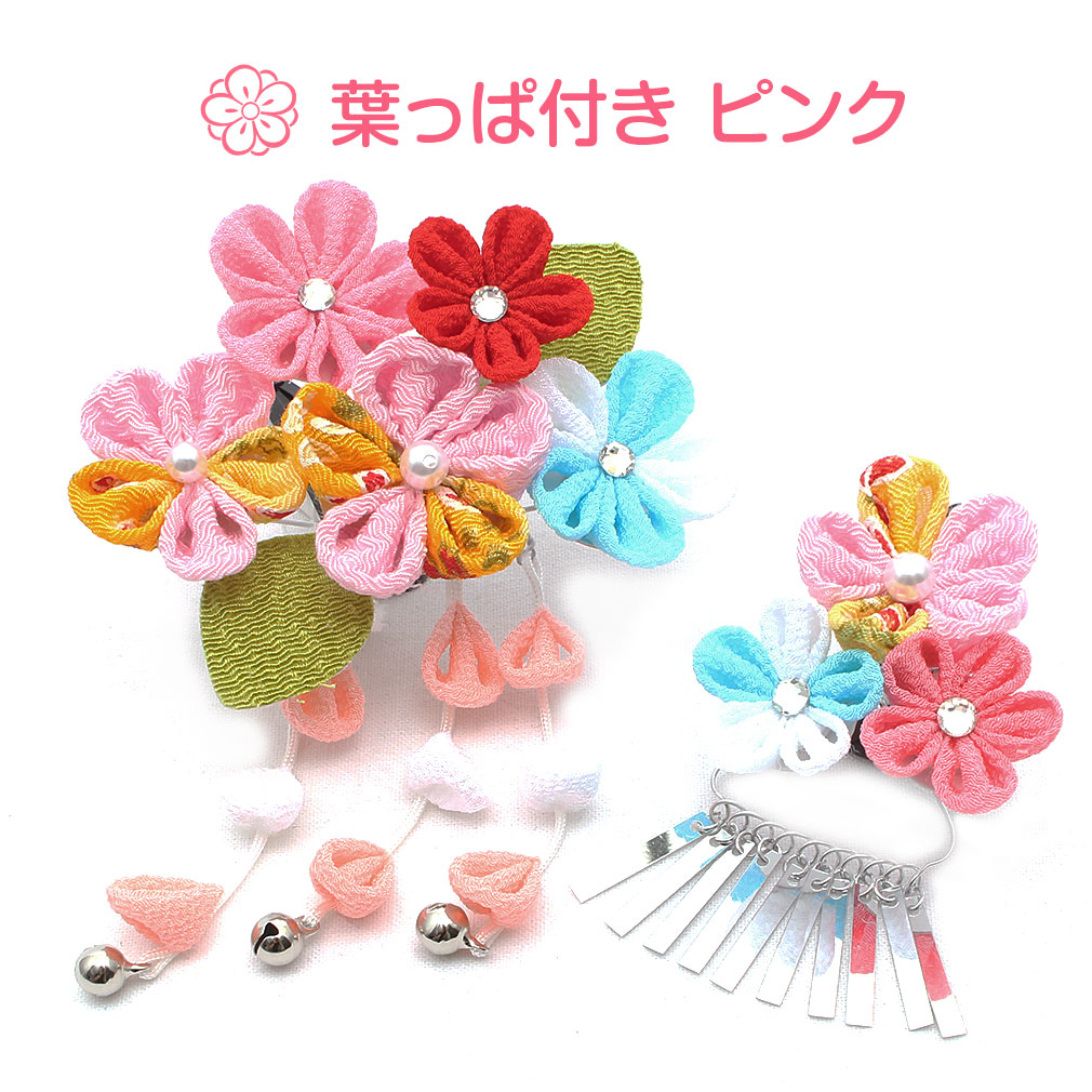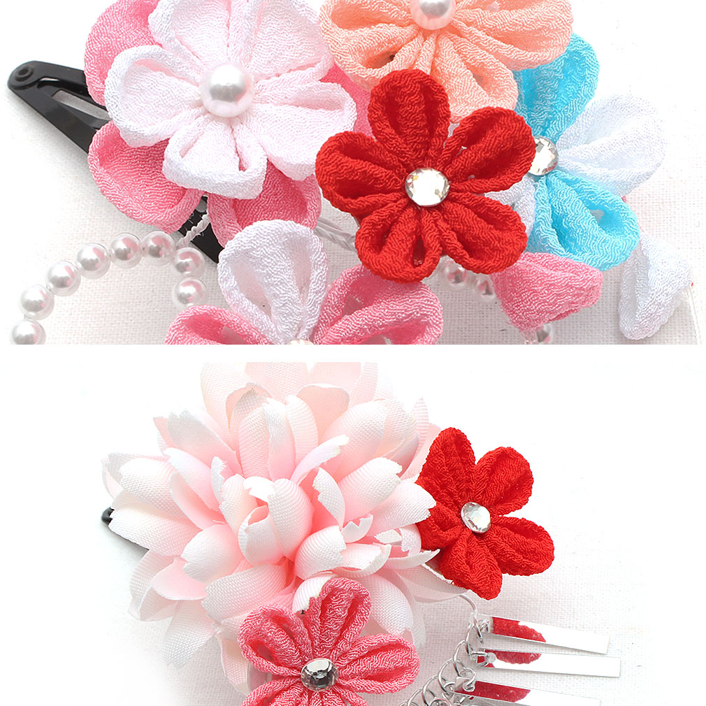 ぷっくらとしたお花のつまみ飾りが可愛らしい髪飾り2点セットです。 房の先には鈴が付いており、ゆらゆらと揺れて音が鳴る姿は何ともキュート。 留め具はパッチン留めタイプのため、量が少なめなお子様も付けられます。 七五三や桃の節句、お正月などの晴れ着姿にあわせてお使い頂ける髪飾りです。