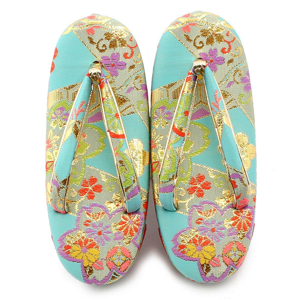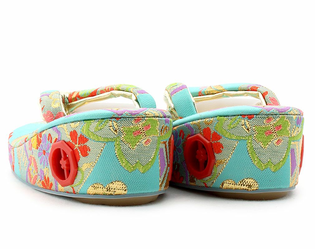 七五三参りやお祝い事にお使い頂ける 女の子用草履をご用意いたしました。 女の子の七五三の晴れ姿をより可愛らしく、着物姿を引き締めるのに欠かせない草履。 鮮やかな水色の生地にゴールドを施した花模様が 晴れ着姿をより華やかにします。 草履には両側に鈴が仕込まれ、歩く度にチリンチリンと可愛らしく鳴ります。 裏面はすべり止め付きで、お子様でも安心して履くことが出来ます。 七五三はもちろん、お正月や結婚のお祝いなど着物でのお出かけにご利用ください。 大人に一歩近づく、一生に一度の大切なお祝い。 お子様の晴れの日にお役に立てる逸品です。