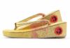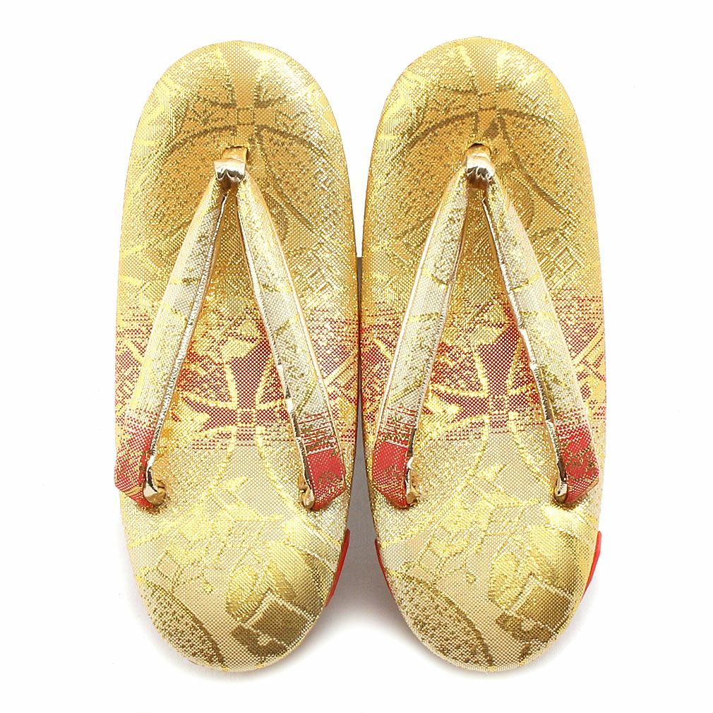 七五三参りやお祝い事にお使い頂ける、女の子用草履をご用意いたしました。 女の子の七五三の晴れ姿をより可愛らしく、着物姿を引き締めるのに欠かせない草履。 ゴールドから朱赤のグラデーションが美しく、散りばめられようにキラキラと光る模様が晴れ着姿をより華やかにします。 煌びやかな草履は、丁子や打ち出の小槌、七宝などが描かれており、お祝いの場に相応しいおめでたい柄付け。 草履には両側に鈴が仕込まれ、歩く度にチリンチリンと可愛らしく鳴ります。 柔らかなクッション加工が施されていますので、お子様の足に優しい作りです。 裏面はすべり止め付きで、お子様でも安心して履くことが出来ます。 七五三はもちろん、お正月や結婚のお祝いなど着物でのお出かけにご利用ください。 大人に一歩近づく、一生に一度の大切なお祝い。 お子様の晴れの日を、かわいらしい草履で、特別な思い出にお役立て下さい。