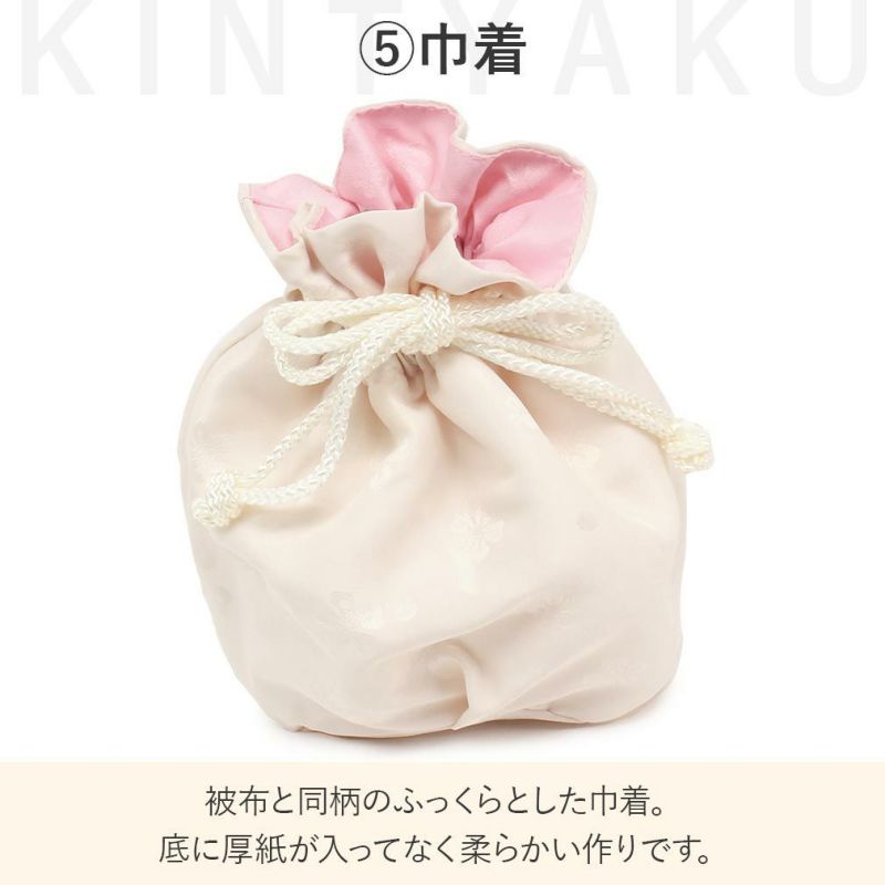 七五三のお祝いを素敵に、可愛く。 3歳の晴れ着をコーディネートした被布7点セットです。 一生に一度の大切な思い出だからこそ、他の子と被らない可愛らしい着物を。 優しいピンク色の地色に橘や藤などの花々が咲き誇る可愛らしく華やかなデザイン。 大正ロマンを思わせる矢羽紋を花丸紋と共に、縞のように現代的にアレンジしたレトロモダンな雰囲気です。 華やかにあしらわれた吉祥紋には、子どもの健やかな成長を願う親心が込められています。 合わせやすい刺しゅう入りの被布コートには、ちりめんの花飾りが胸元のアクセントに。 中綿入りなので、ふっくらとしたフォルムが3歳の可愛らしさをより引き立てます。 見た目はすっきりとしたシルエットながら、スナップボタンでしっかり留められますので、元気なお子様にも安心の着こなし。 三つ身着物や、長襦袢、重ね襟は統一感ある色味でトータルコーディネートいたしました。 色鮮やかな朱赤・黄緑色の重ね襟は、お顔を周りが華やかになり晴れの日の装いにぴったり。 着物や長襦袢には腰ひもが縫い付けられていますので、着付けも簡単に。 肩上げ・腰上げ済みなので届いたその日にすぐにご着用できます。 被布と同色の巾着は、コロンとしたかわいいシルエット。 写真撮りのアクセントはもちろん、飴玉などのお子様が喜ぶ小物を入れてみたり、あると便利な巾着です。 女の子の着物にぴったりな白色の草履は、柔らかな花緒で履きやすく、かかとに滑り止め付き。 付属の可愛い髪飾りも、お嬢様を一層愛らしく魅せます。 七五三だけでなく、お正月や端午の節句、結婚式など、活躍シーンはさまざま。 一度きりのレンタルよりも、色々なシーンで楽しめるお得な被布セットです。 ワンランク上の華やかなお着物で、心に残る記念日をお楽しみください。