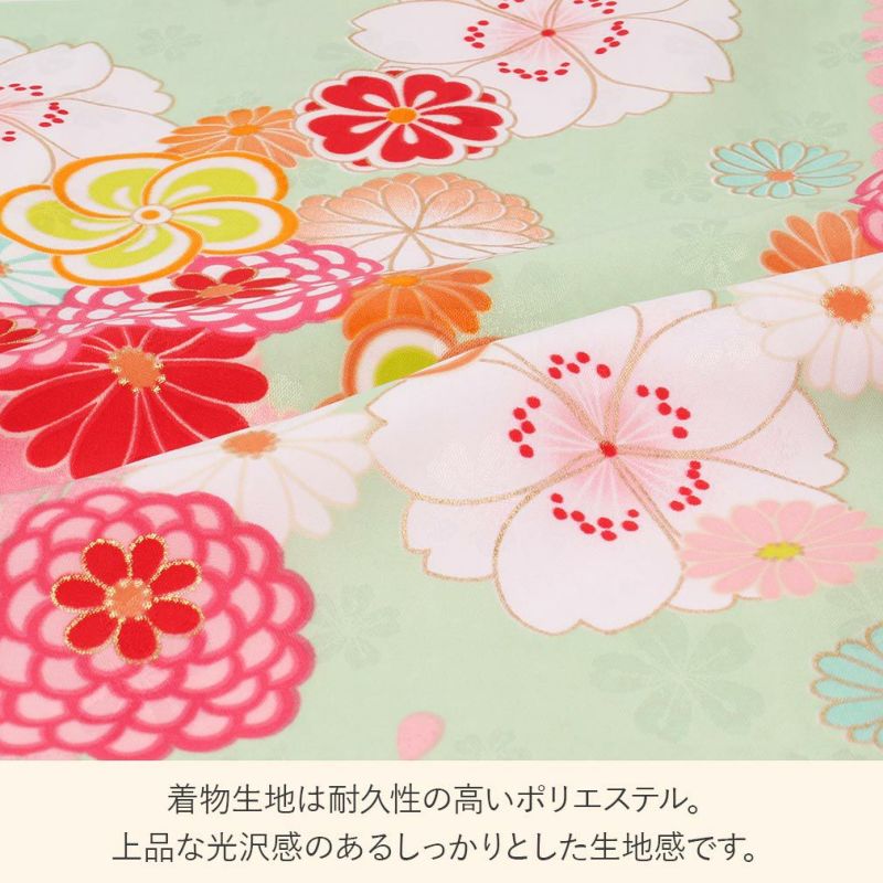 七五三のお祝いを素敵に、可愛く。 3歳の晴れ着をコーディネートした被布7点セットです。 一生に一度の大切な思い出だからこそ、他の子と被らない可愛らしい着物を。 淡いパステル調の地色に万寿菊や藤、八重桜などの花々が咲き誇る可愛らしく華やかなデザイン。 菊や鹿の子紋などの吉祥紋には、幸福や繁栄を願う親心が込められています。 被布には、ちりめんの花飾りが胸元のアクセントに。 中綿入りなので、ふっくらとしたフォルムが3歳の可愛らしさをより引き立てます。 見た目はすっきりとしたシルエットながら、スナップボタンでしっかり留められますので、元気なお子様にも安心の着こなし。 三つ身着物や、長襦袢、重ね襟は統一感ある色味でトータルコーディネートいたしました。 色鮮やかな朱赤・黄緑色の重ね襟は、お顔を周りが華やかになり晴れの日の装いにぴったり。 着物や長襦袢には腰ひもが縫い付けられていますので、着付けも簡単に。 肩上げ・腰上げ済みなので届いたその日にすぐにご着用できます。 被布と同柄の巾着は、コロンとしたかわいいシルエット。 写真撮りのアクセントはもちろん、飴玉などのお子様が喜ぶ小物を入れてみたり、あると便利な巾着です。 女の子の着物にぴったりな白色の草履は、柔らかな花緒で履きやすく、かかとに滑り止め付き。 付属の可愛い髪飾りも、お嬢様を一層愛らしく魅せます。 七五三だけでなく、お正月や端午の節句、結婚式など、活躍シーンはさまざま。 一度きりのレンタルよりも、色々なシーンで楽しめるお得な被布セットです。 ワンランク上の華やかなお着物で、心に残る記念日をお楽しみください。
