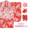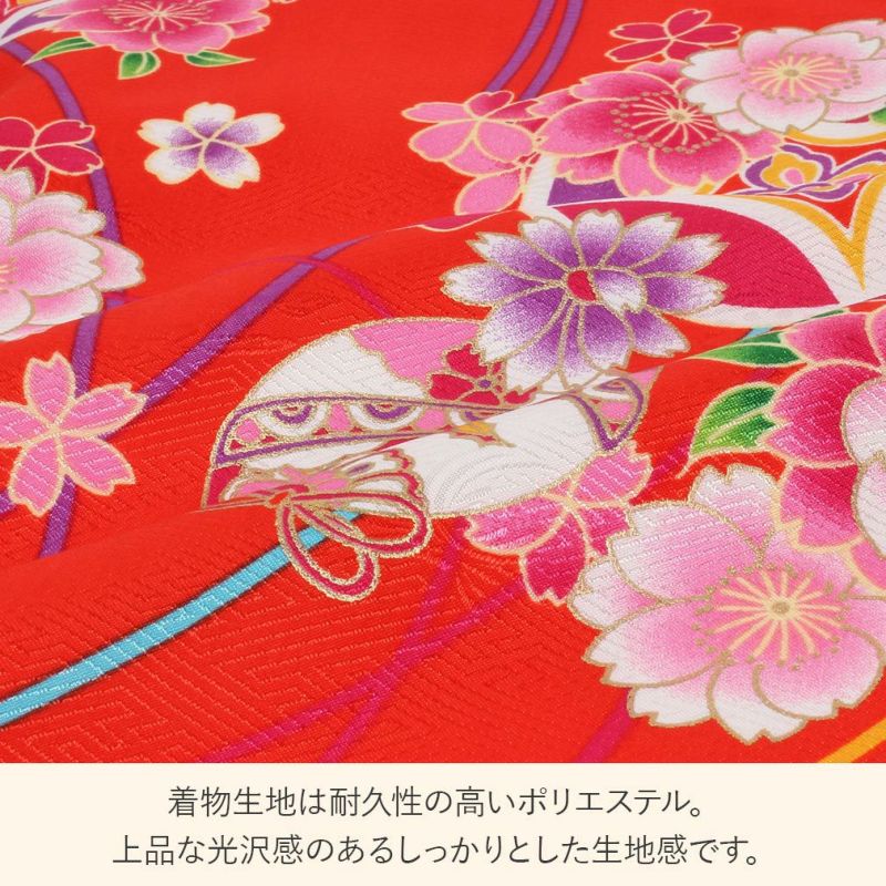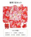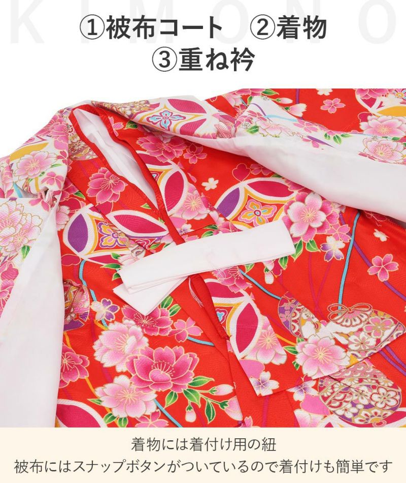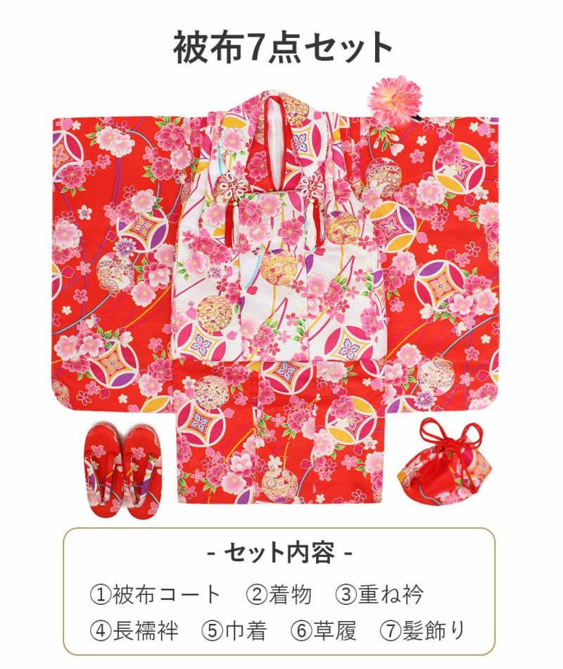 七五三のお祝いを素敵に、可愛く。 3歳の晴れ着をコーディネートした被布7点セットです。 一生に一度の大切な思い出だからこそ、他の子と被らない可愛らしい着物を。 鮮やかな朱赤地に鈴や花七宝、八重桜などの花々が咲き誇る華やかなデザイン。 鈴や花七宝などの吉祥紋には、子どもの健やかな成長を願う親心が込められています。 被布には花飾りのタッセルが揺れ、着姿のアクセントに。 中綿入りなので、ふっくらとしたフォルムが3歳の可愛らしさをより引き立てます。 見た目はすっきりとしたシルエットながら、スナップボタンでしっかり留められますので、元気なお子様にも安心の着こなし。 三つ身着物や、長襦袢、重ね襟は統一感ある色味でトータルコーディネートいたしました。 色鮮やかな赤色の重ね襟は、お顔を周りが華やかになり晴れの日の装いにぴったり。 着物や長襦袢には腰ひもが縫い付けられていますので、着付けも簡単に。 肩上げ・腰上げ済みなので届いたその日にすぐにご着用できます。 着物に合った巾着は、コロンとしたかわいいシルエット。 写真撮りのアクセントはもちろん、飴玉などのお子様が喜ぶ小物を入れてみたり、あると便利な巾着です。 着物と同柄で作られた草履は二石花緒があしらわれ、足元から華やかな装いに。 かかとにはゴム製の滑り止め付きなので、元気なお嬢様にも安心。 付属の可愛い髪飾りも、お嬢様を一層愛らしく魅せます。 七五三だけでなく、お正月や端午の節句、結婚式など、活躍シーンはさまざま。 一度きりのレンタルよりも、色々なシーンで楽しめるお得な被布セットです。 ワンランク上の華やかなお着物で、心に残る記念日をお楽しみください。