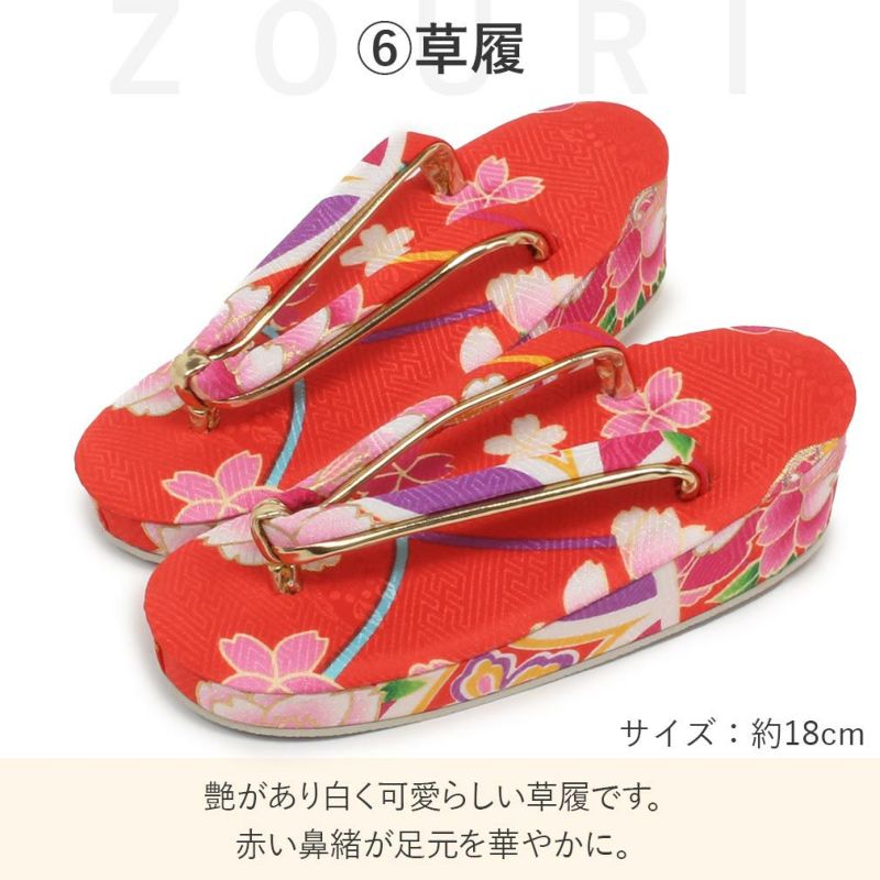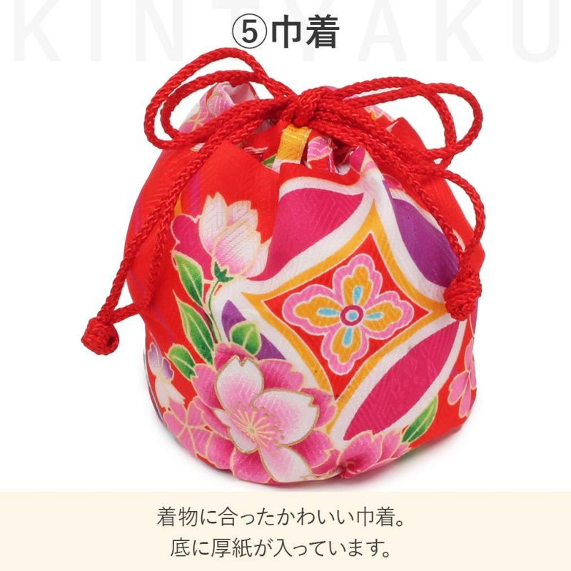 着物(腰ひも付き)・被布・伊達襟(重ね衿)・長襦袢(腰ひも無し)・草履・巾着・髪飾り