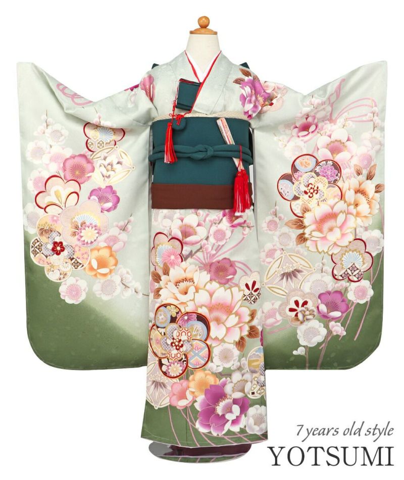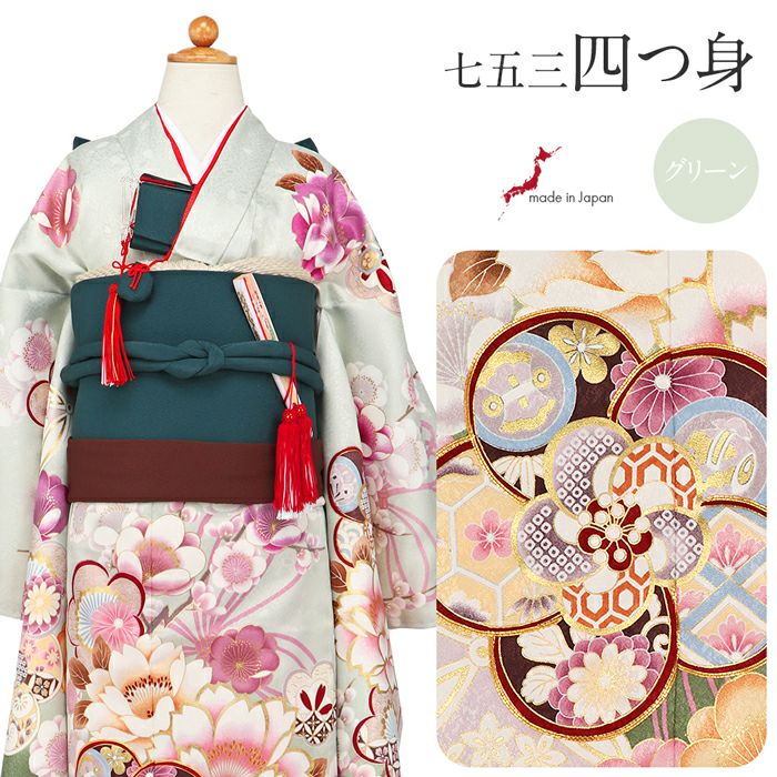 女の子の7歳のお祝いである「帯解きの儀(おびときのぎ)」は、幅の広い帯を結び始める、大人に一歩近づくお祝い。 大切な思い出を彩る「しゃれっこ」ブランドの四つ身着物3点セットをご紹介いたします。 淡いグリーン地に、八重桜や梅などが咲き誇る麗らかで女の子らしいデザイン。 束ねたモチーフの組紐は、花々に寄り添い可愛らしい印象に。 寒い冬を耐えて春にはいち早く花開く梅は、忍耐力や生命力を願う紋様として愛されてきました。 縁起物とされる宝尽くし紋は、福徳を呼ぶ吉祥文様とされお子様の活躍や成長の願う親心が込められています。 ねじ梅の縁取りには金駒刺繍が施され、ふっくらとした質感や、煌びやかな輝きが映える豪華な意匠。 着物一面に散らされた花が豪華絢爛に咲き誇り晴れの日を美しく彩ります。 セットでお届けする長襦袢は、肌映りの良い白色の亀甲柄。 袖や裾から柄の長襦袢がチラッと見えた時にとってもオシャレ。 お好みで半襟を付けて、さらに着姿を可愛らしく見せても。 お着物は、高級ポリエステル素材を使用していて肌触りも滑らか。 お手入れしやすい素材なので、汚れを気にせずに着こなせます。 衿元も重ね襟がついているので華やか。 朱赤色の重ね衿は、光によって綾亀甲紋が浮かび上がり顔周りを美しく引き立てます。 長襦袢、お着物は日本製なので安心してお使いいただけます。 ご姉妹での着用や、肩・腰上げをすることで7歳以外の七五三にもお使いいただけます。 七五三だけでなく、お正月やひな祭り、結婚式や卒園式の袴姿など活躍シーンも豊富な着物です。 他の人とは違うオシャレにこだわりたい、そんなお洒落女子におススメする、ワンランク上の四つ身着物。 可愛らしくも、大人っぽくも見えるこだわりの着物を着て、晴れの日を楽しんでみてはいかがでしょうか。