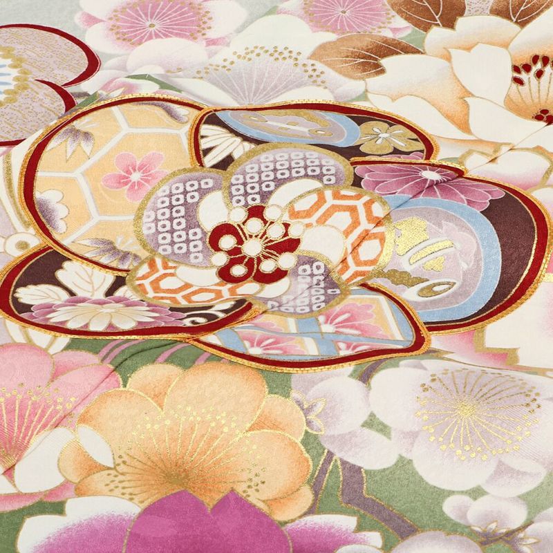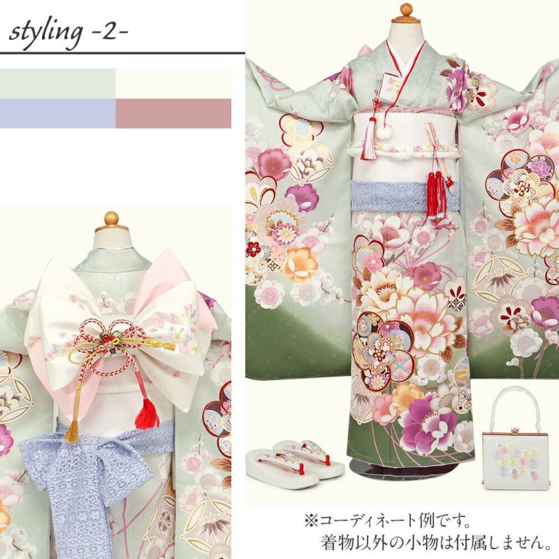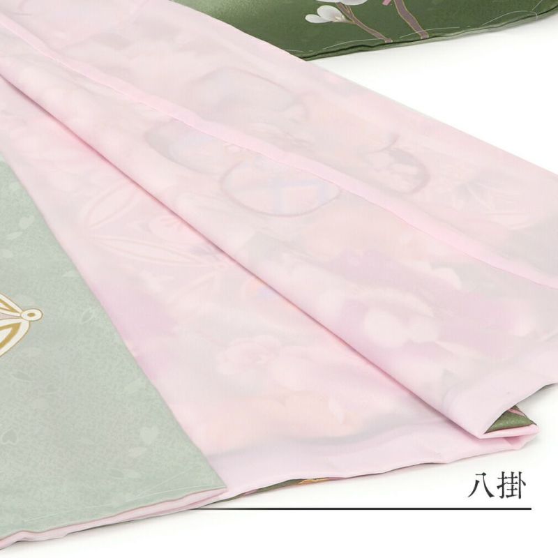 [着物]薄グリーン、モスグリーン、ゴールド、ピンク、パープル、ブラウン、クリーム、エンジ、ホワイト [長襦袢]白色 [重ね衿]朱赤