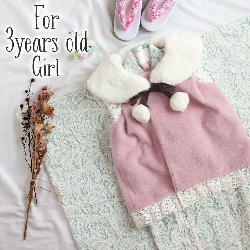七五三のお祝いを素敵に、可愛く。 3歳の晴れ着をコーディネートした三つ身着物3点セットです。 一生に一度の大切な思い出だからこそ、他の子と被らない可愛らしいレース着物を。 透け感のある花をモチーフにしたレース生地は、ふんわりとした優しい色味で女の子があこがれそうなたくさんの可愛いが詰まっています。 レースの隙間から透けて見える色味がとってもキュート。 三つ身着物や、長襦袢、重ね襟は淡い色味でトータルコーディネートいたしました。 フェイクファー襟付きの被布コートは、毛足の長いファー生地の光沢感が魅力的。 レース飾りと合わせて、ふんわり可愛らしい印象。 見た目はすっきりとしたシルエットながら、隠しボタンでしっかり留められますので、元気なお子様にも安心の着こなし。 ファー襟は、お手持ちのワンピースやコートと合わせるなど、活躍の場が広がります。 肩上げ済みなので届いたその日にすぐにご着用できます。 さらにご家庭でのお洗濯ができるので、汚れや食べこぼしも気にせず、安心して晴れの日をお過ごしいただけます。 七五三だけでなく、お正月やひな祭り、結婚式など、活躍シーンはさまざま。 ワンランク上のお着物で、心に残る記念日をお楽しみください。