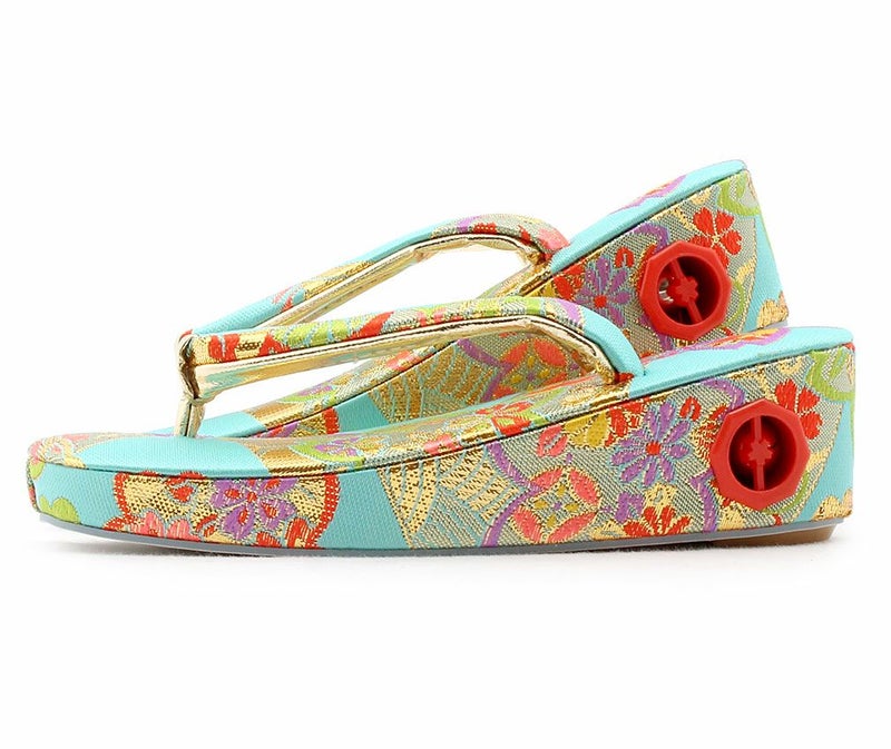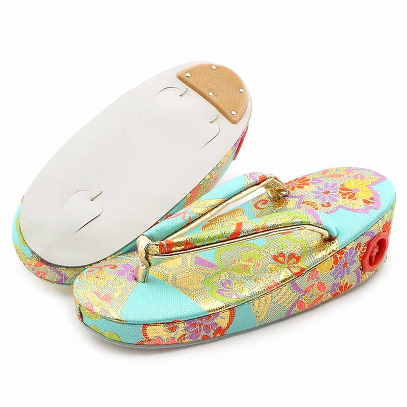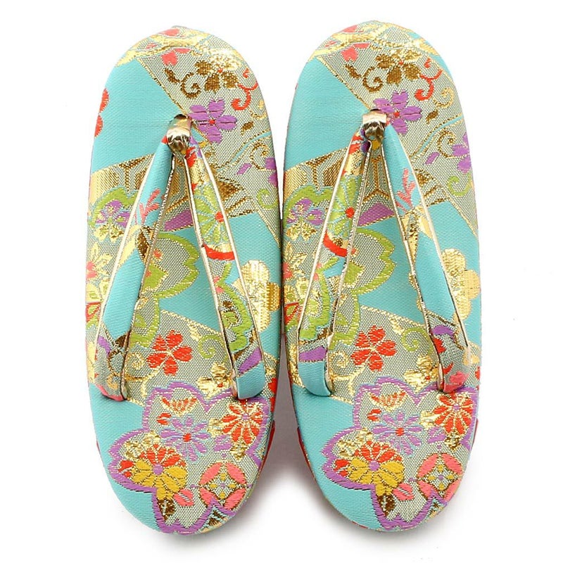 七五三参りやお祝い事にお使い頂ける 女の子用草履をご用意いたしました。 女の子の七五三の晴れ姿をより可愛らしく、着物姿を引き締めるのに欠かせない草履。 鮮やかな水色の生地にゴールドを施した花模様が 晴れ着姿をより華やかにします。 草履には両側に鈴が仕込まれ、歩く度にチリンチリンと可愛らしく鳴ります。 裏面はすべり止め付きで、お子様でも安心して履くことが出来ます。 七五三はもちろん、お正月や結婚のお祝いなど着物でのお出かけにご利用ください。 大人に一歩近づく、一生に一度の大切なお祝い。 お子様の晴れの日にお役に立てる逸品です。