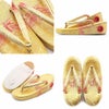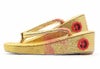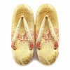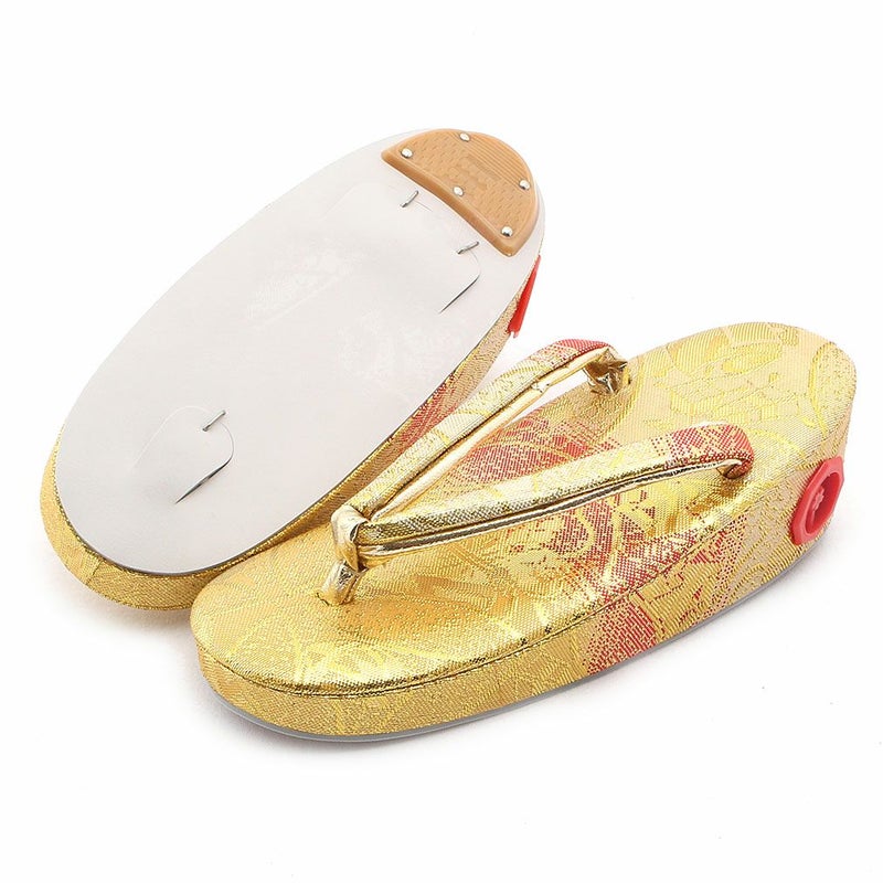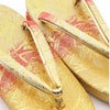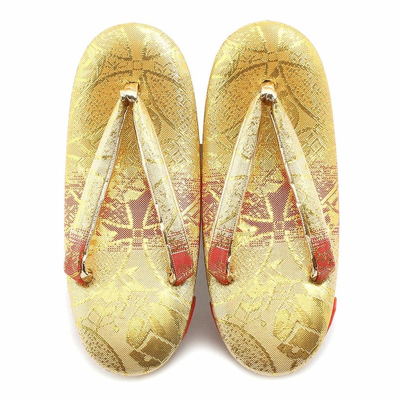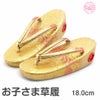 七五三参りやお祝い事にお使い頂ける、女の子用草履をご用意いたしました。 女の子の七五三の晴れ姿をより可愛らしく、着物姿を引き締めるのに欠かせない草履。 ゴールドから朱赤のグラデーションが美しく、散りばめられようにキラキラと光る模様が晴れ着姿をより華やかにします。 煌びやかな草履は、丁子や打ち出の小槌、七宝などが描かれており、お祝いの場に相応しいおめでたい柄付け。 草履には両側に鈴が仕込まれ、歩く度にチリンチリンと可愛らしく鳴ります。 柔らかなクッション加工が施されていますので、お子様の足に優しい作りです。 裏面はすべり止め付きで、お子様でも安心して履くことが出来ます。 七五三はもちろん、お正月や結婚のお祝いなど着物でのお出かけにご利用ください。 大人に一歩近づく、一生に一度の大切なお祝い。 お子様の晴れの日を、かわいらしい草履で、特別な思い出にお役立て下さい。