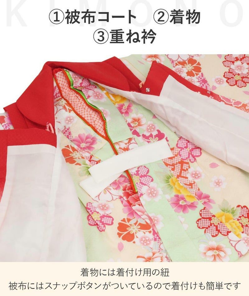 着物:黄緑、クリーム、レッド、ピンク、ホワイト 被布コート:レッド