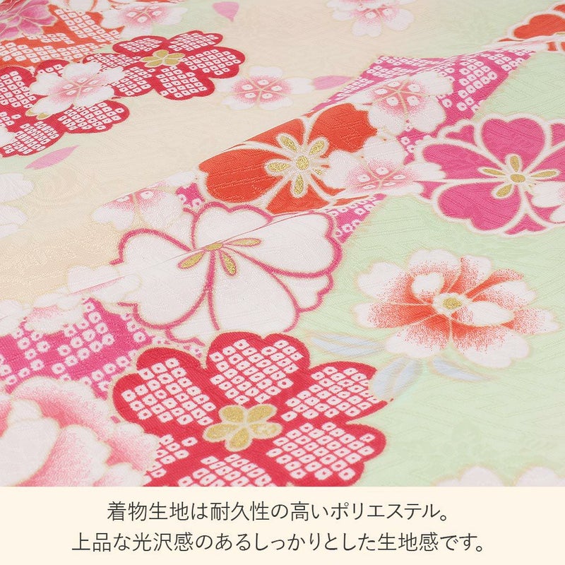 七五三のお祝いを素敵に、可愛く。 3歳の晴れ着をコーディネートした被布7点セットです。 一生に一度の大切な思い出だからこそ、他の子と被らない可愛らしい着物を。 優しいパステル色の地色に牡丹や桜などの花々が咲き誇る可愛らしく華やかなデザイン。 牡丹や鹿の子紋などの吉祥紋には、幸福や繁栄を願う親心が込められています。 被布には、ちりめんの花飾りが胸元のアクセントに。 中綿入りなので、ふっくらとしたフォルムが3歳の可愛らしさをより引き立てます。 見た目はすっきりとしたシルエットながら、スナップボタンでしっかり留められますので、元気なお子様にも安心の着こなし。 三つ身着物や、長襦袢、重ね襟は統一感ある色味でトータルコーディネートいたしました。 色鮮やかな朱赤・黄緑色の重ね襟は、お顔を周りが華やかになり晴れの日の装いにぴったり。 着物や長襦袢には腰ひもが縫い付けられていますので、着付けも簡単に。 肩上げ・腰上げ済みなので届いたその日にすぐにご着用できます。 着物と同色の巾着は、コロンとしたかわいいシルエット。 写真撮りのアクセントはもちろん、飴玉などのお子様が喜ぶ小物を入れてみたり、あると便利な巾着です。 女の子の着物にぴったりな白色の草履は、柔らかな花緒で履きやすく、かかとに滑り止め付き。 付属の可愛い髪飾りも、お嬢様を一層愛らしく魅せます。 七五三だけでなく、お正月や端午の節句、結婚式など、活躍シーンはさまざま。 一度きりのレンタルよりも、色々なシーンで楽しめるお得な被布セットです。 ワンランク上の華やかなお着物で、心に残る記念日をお楽しみください。