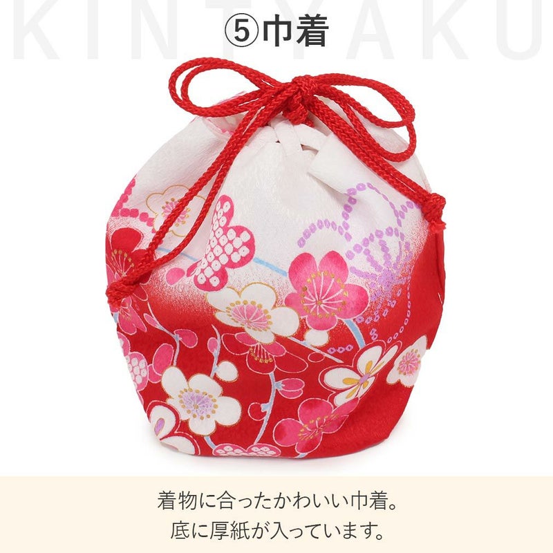 着物(腰ひも付き)・被布・伊達襟(重ね衿)・長襦袢(腰ひも無し)・草履・巾着・髪飾り