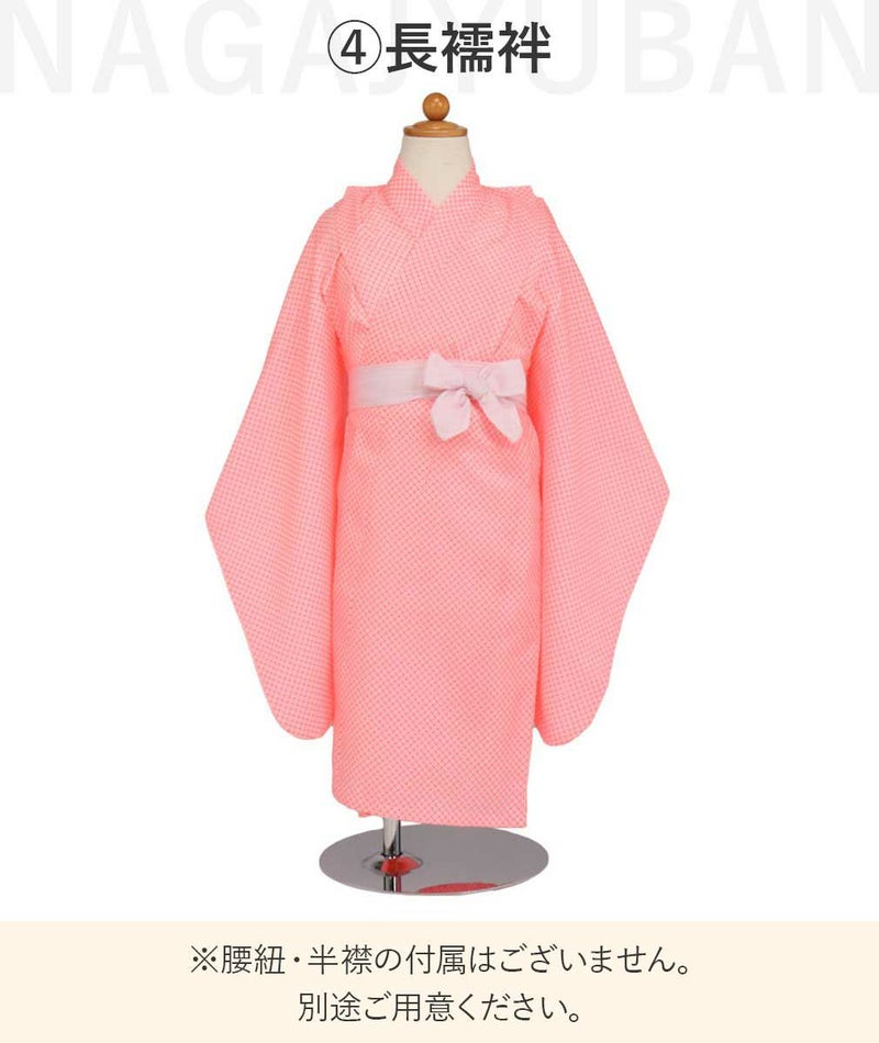 着物(腰ひも付き)・被布・伊達襟(重ね衿)・長襦袢(腰ひも無し)・草履・巾着・髪飾り