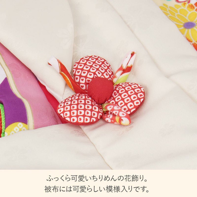 七五三のお祝いを素敵に、可愛く。 3歳の晴れ着をコーディネートした被布7点セットです。 一生に一度の大切な思い出だからこそ、他の子と被らない可愛らしい着物を。 優しいピンク色の地色に橘や藤などの花々が咲き誇る可愛らしく華やかなデザイン。 大正ロマンを思わせる矢羽紋を花丸紋と共に、縞のように現代的にアレンジしたレトロモダンな雰囲気です。 華やかにあしらわれた吉祥紋には、子どもの健やかな成長を願う親心が込められています。 合わせやすい刺しゅう入りの被布コートには、ちりめんの花飾りが胸元のアクセントに。 中綿入りなので、ふっくらとしたフォルムが3歳の可愛らしさをより引き立てます。 見た目はすっきりとしたシルエットながら、スナップボタンでしっかり留められますので、元気なお子様にも安心の着こなし。 三つ身着物や、長襦袢、重ね襟は統一感ある色味でトータルコーディネートいたしました。 色鮮やかな朱赤・黄緑色の重ね襟は、お顔を周りが華やかになり晴れの日の装いにぴったり。 着物や長襦袢には腰ひもが縫い付けられていますので、着付けも簡単に。 肩上げ・腰上げ済みなので届いたその日にすぐにご着用できます。 被布と同色の巾着は、コロンとしたかわいいシルエット。 写真撮りのアクセントはもちろん、飴玉などのお子様が喜ぶ小物を入れてみたり、あると便利な巾着です。 女の子の着物にぴったりな白色の草履は、柔らかな花緒で履きやすく、かかとに滑り止め付き。 付属の可愛い髪飾りも、お嬢様を一層愛らしく魅せます。 七五三だけでなく、お正月や端午の節句、結婚式など、活躍シーンはさまざま。 一度きりのレンタルよりも、色々なシーンで楽しめるお得な被布セットです。 ワンランク上の華やかなお着物で、心に残る記念日をお楽しみください。