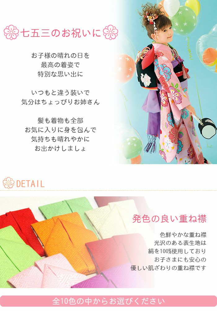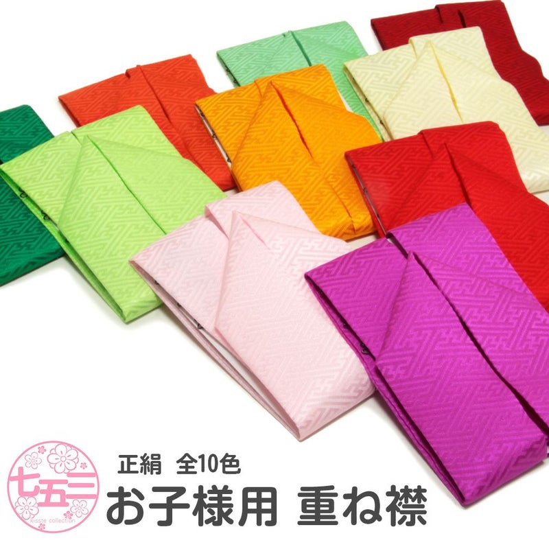 七五三のお着物姿に欠かせない、お子様用の重ね襟です。 光沢のある表生地は絹100%の生地を使用しており、お子様にも安心の優しい肌触りです。 重ね襟を着物に固定する為の金具が付いているので、縫い付けることなくご着用いただけます。 10色展開でご用意いたしました。お子様のお好みや着物の色目にあわせてお選びください。
