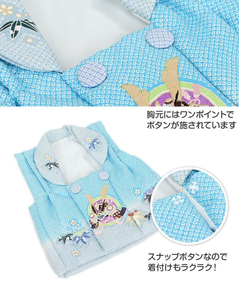 他の画像を見る <花うさぎ> 二部式ベビー被布セット 赤ちゃん用きもの 二部式ベビー被布セット 男の子用 花うさぎ 水色 黒 松竹梅 兜 0歳 1歳 2歳 赤ちゃん ベビー 被布 セット 晴れ着 きもの 着物 男の子 小物 和装 70cm 80cm 当店特別価格 ¥ 17,600 税込 カートに入れる お気に入りに登録する