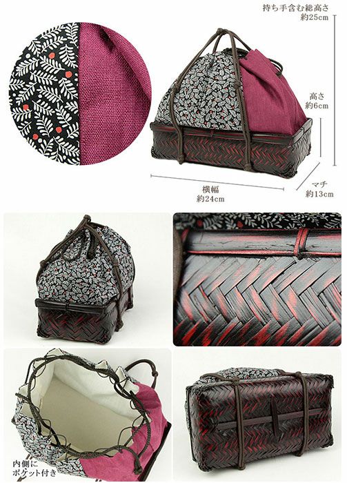 表地:(柄部分)綿100% (無地部分)麻100% 裏地:ポリエステル70% 綿30% カゴ:竹製品