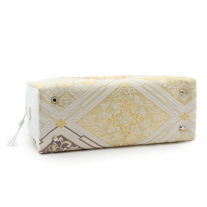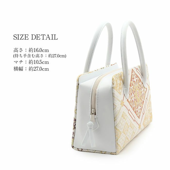 ■■礼装からお茶席まで。晴れの日を彩る高級利休バッグ。■■ 正絹帯地を使用したバッグ生地に施された縁起の良い柄付きが、お着物姿をさらに美しく演出します。 バッグの収納スペースはファスナーの開閉部分と両サイドの3つに分かれており、両サイドにはハンカチや携帯電話などが収納できます。 中央のファスナー部分は大きく開いて取り出しやすく、袱紗や小物がゆったりと収納できる大きさ。 自立する設計で、型崩れしにくいデザインも魅力です。 バッグの底には四隅に鋲がついており スレや傷、汚れなどからバッグを守ってくれます。 訪問着や色無地など御茶席はもちろん、結婚式などのおめでたいお席にもお薦めの商品です。 レンタルの着物であったり譲りものの着物をお召しの機会であっても、一つでもご自身で選んだこだわりのアイテムがあるとお慶びの席のご気分が高まるでしょう。 たった一つの和装バッグでもコーディネート全体の印象をぐっと変えることが出来るのが着物の楽しいところです。 ぜひお慶びの席の留袖・訪問着に、利休バッグを新調してみませんか。
