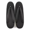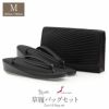 お子様の入学式や卒業式やお受験やお葬式、冠婚葬祭全般に合わせていただけるブラックフォーマル草履バッグセットをご用意致しました。 クラッチタイプのバッグは、独特の凹凸感を持つデザインで高級感のある仕上がり。 付属のチェーンを使えばショルダーバッグにも、そのまま持てばクラッチでもご使用いただけます。 流行りの小さめスタイルのバッグは、小ぶりのお財布や袱紗など ちょっとした小物が入ります。 バッグの中は内ポケットもついているので、鍵などの小さい物も散らばらず収納できます。 フラップの留め具はマグネット仕様で開け閉めがしやすく側面がアコーディオン仕様になっているため、開口部が大きく開くのでバッグの中が見やすく、出し入れしやすいのも魅力です。 ワンポイントの銀杏の飾りが上品なこちらのバッグ。洋装にもお着物にもご利用いただけます。 鼻緒にはバッグと同じ生地が使われており、上品な輝きとコーディネート全体の統一感を演出します。 バッグと同じデザインの草履の花緒が統一感をプラス。 かかとの高さは1枚芯の4cmと程よいヒール高。 草履台にはクッション加工が施されており、歩きやすくソフトな履き心地です。 シンプルなデザインは年齢や立場に関係なくお使いいただけます。 お葬式や法事など、いざという時にお使いいただける和洋兼用タイプの喪服用草履バッグセットです。