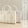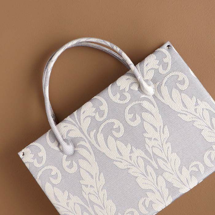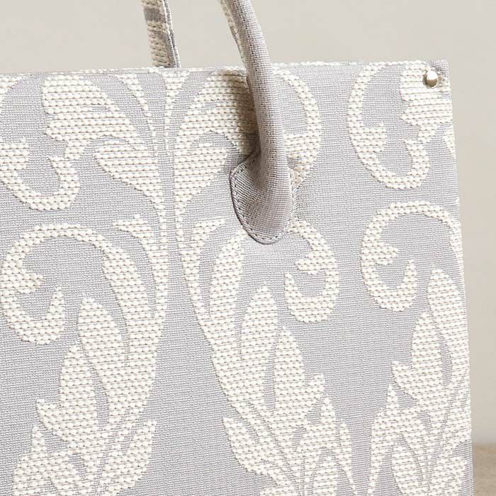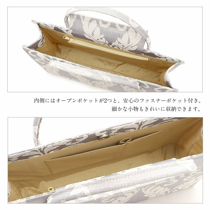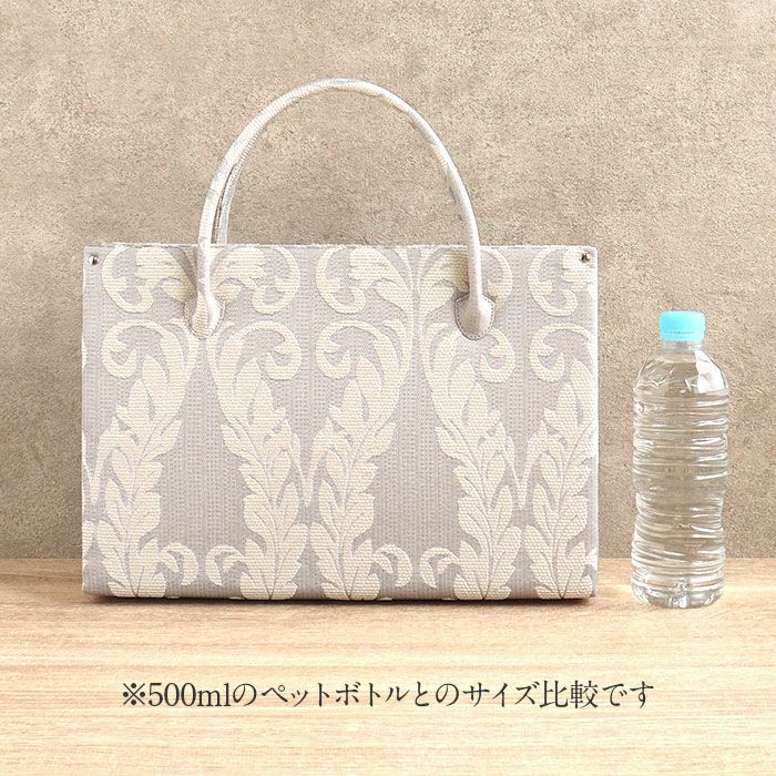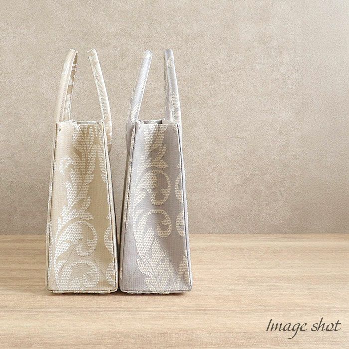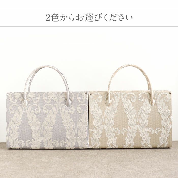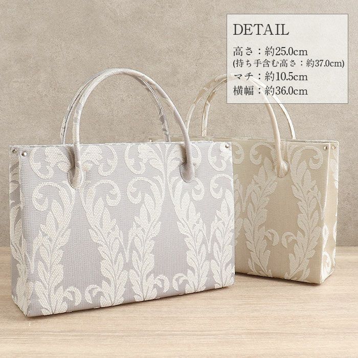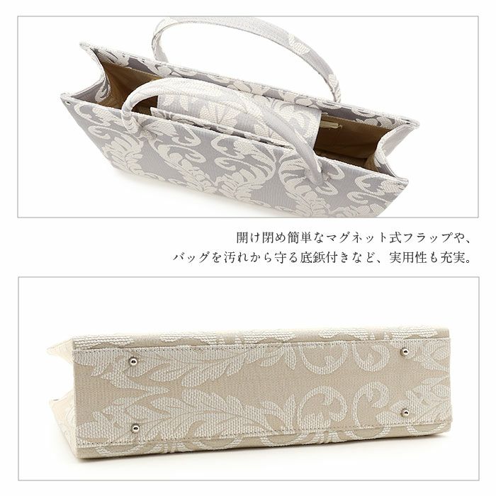 ■ダマスクリーフ模様が華やかさを添える、白梅ブランドのカジュアルバッグ■ ゴールドベージュとシルバーグレーの落ち着いたカラーに、上品なリーフ模様をあしらいました。 マグネット付きの内フラップはワンタッチで簡単開閉。 中身を隠してすっきり持てる、スマート仕様です。 また、バッグの内側には大小のオープンポケットが2つと、ファスナーポケットを備えているので小物の出し入れもしやすいのも嬉しいポイントです。 底鋲付きで擦れや汚れを防ぎ、安心してお使いいただけます。 A4サイズがすっきり収まる大きさで、お買い物やお稽古、お出かけシーンをきれいめに演出。 和装にも洋装にも合わせやすい、きれいめカジュアルなバッグ。 プレゼントとしても喜ばれること間違いなしのアイテムです。