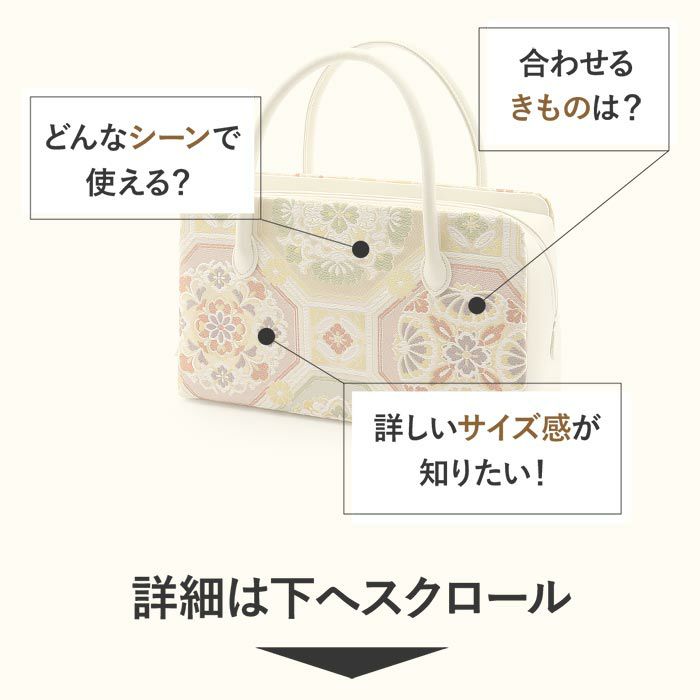他の画像を見る 《値下げ!23000円→18000円》正絹帯地を使用した礼装スタイルにぴったりの高級利休バッグ 利休バッグ <クリーム&ゴールド/雪輪華紋> 正絹帯地 日本製高級バッグ 当店特別価格 ¥ 19,800 税込 (0) カートに入れる お気に入りに登録する