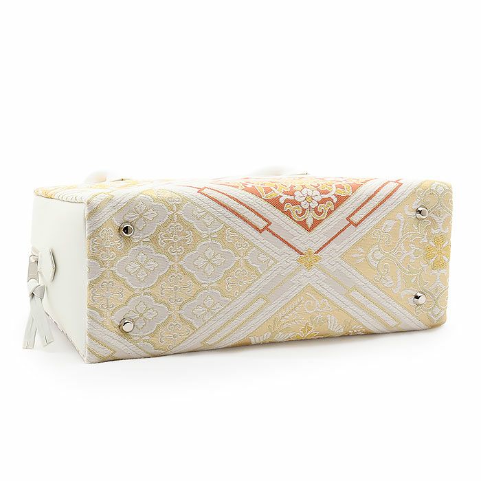 ■■礼装からお茶席まで。晴れの日を彩る高級利休バッグ。■■ 正絹帯地を使用したバッグ生地に施された縁起の良い柄付きが、お着物姿をさらに美しく演出します。 バッグの収納スペースはファスナーの開閉部分と両サイドの3つに分かれており、両サイドにはハンカチや携帯電話などが収納できます。 中央のファスナー部分は大きく開いて取り出しやすく、袱紗や小物がゆったりと収納できる大きさ。 自立する設計で、型崩れしにくいデザインも魅力です。 バッグの底には四隅に鋲がついており スレや傷、汚れなどからバッグを守ってくれます。 訪問着や色無地など御茶席はもちろん、結婚式などのおめでたいお席にもお薦めの商品です。 レンタルの着物であったり譲りものの着物をお召しの機会であっても、一つでもご自身で選んだこだわりのアイテムがあるとお慶びの席のご気分が高まるでしょう。 たった一つの和装バッグでもコーディネート全体の印象をぐっと変えることが出来るのが着物の楽しいところです。 ぜひお慶びの席の留袖・訪問着に、利休バッグを新調してみませんか。