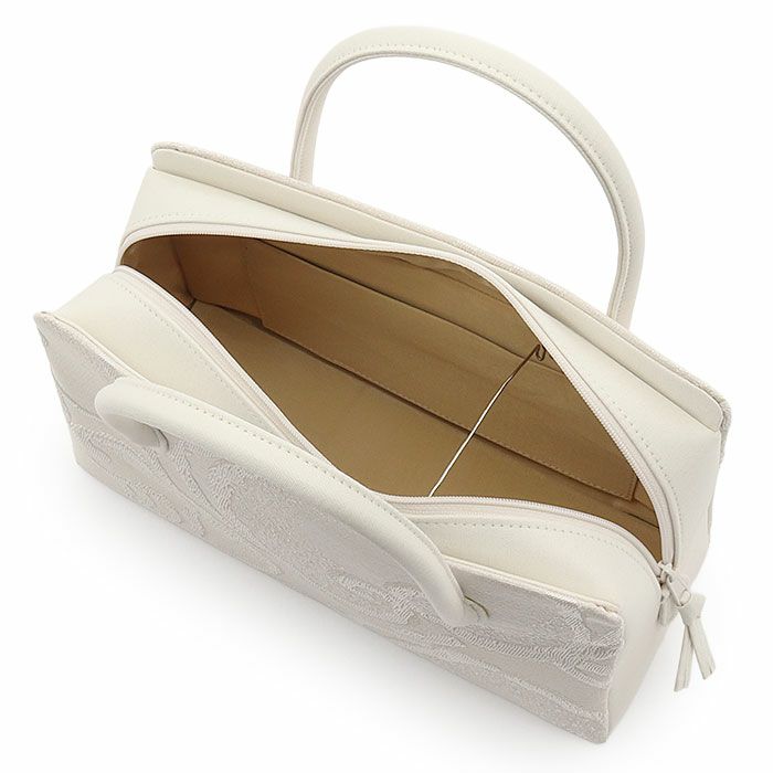 ■ 晴れの日に寄り添う、白銀の静かな華やぎ ■ 優しい色合いのオフホワイトと、上品に煌めくシルバーの唐草文様。 主張を抑えた色使いが、西陣織・正絹ならではの質感と立体感をいっそう引き立てる利休バッグです。 唐草文様は、古くから途切れることのない美しさを象徴する吉祥柄。 繊細な織りによって表現された文様が、光の角度で静かに表情を変え、フォーマルな装いに洗練された印象を添えます。 華美になりすぎないため、訪問着や付下げ、格式あるお出かけに最適。 落ち着きと清潔感を兼ね備えた、大人のためのフォーマルバッグです。 ーおすすめポイントー ・西陣織の正絹生地を使用した、上質感あふれる仕立て ・オフホワイト×シルバーの唐草文様が、装いに静かな華やぎをプラス ・大きく開く中央ファスナーで、小物の出し入れもスムーズ ・荷物を美しく整えられる三分割構造 ・底鋲付きで、擦れや汚れを防ぎ安心して使用可能 控えめだからこそ、美しさが際立つ。 装いを選ばず、品格だけを添えてくれる利休バッグです。