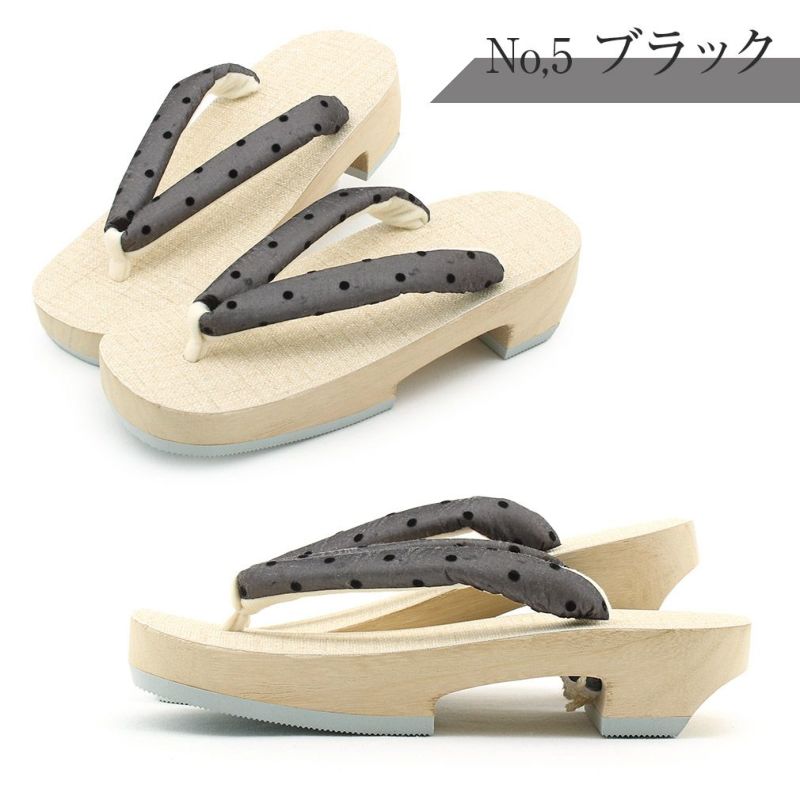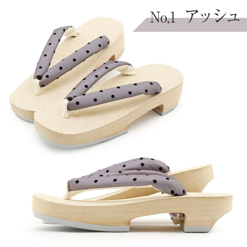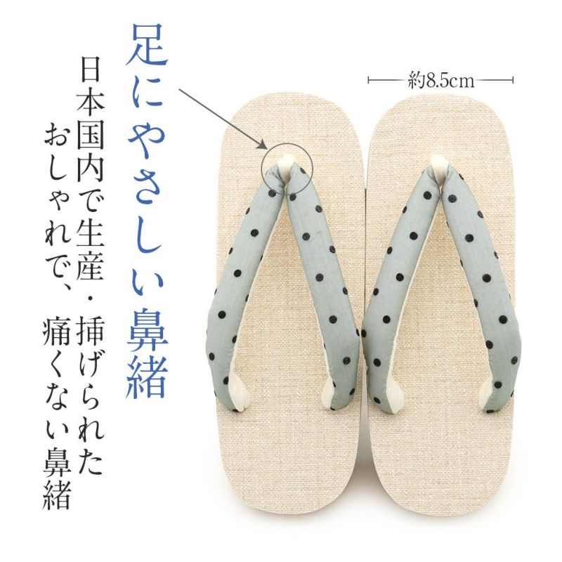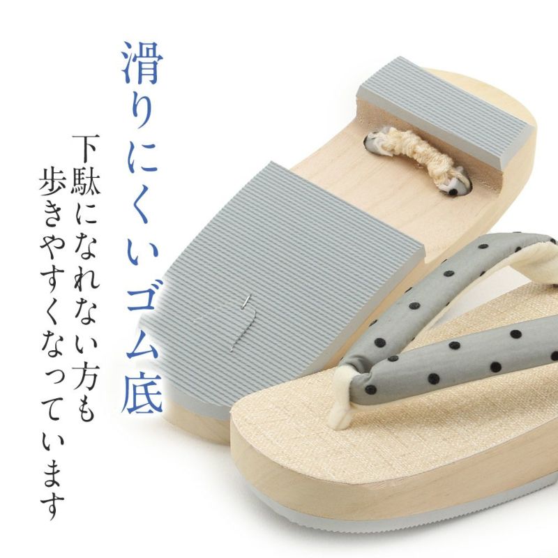 涼しげな白台の木目が美しい、水玉フロッキーレースを施した花緒を使用したお洒落桐下駄です。 レース花緒は、シアードット柄の透け感が可愛くアクセントになっています。 幅広の花緒は裏地の起毛素材がふんわりと柔らかで、足の甲をやさしく包み込みます。 麻のようなプリント張りが施された桐下駄は、サラリとして暑い日もベタつかず 心地よい履き心地。 裸足でご使用されても汚れにくくなっており 夏のお祭りや花火大会での浴衣や、カジュアルな夏着物にもお似合いです。 とても軽く水気に強い桐素材は程よい固さで足に馴染み、素敵な足音と歩く楽しさが感じられる逸品。 ヒールの高さは約4cmと程良い高さで歩きやすく、着姿も美しく見えます。 安心の日本製で、裏にはしっかりと滑り止めも付いておりますが、軽やかさは損なわず、夏の足元にピッタリ。 夏の浴衣はもちろんのこと、麻や綿のきもの、小紋や紬など、季節を問わず一年中楽しめる定番履物の日本製桐下駄です。 合わせやすい色合いの花緒で5色ご用意いたしました。お好みの下駄をお手元にとり履き心地をお楽しみ下さい。