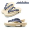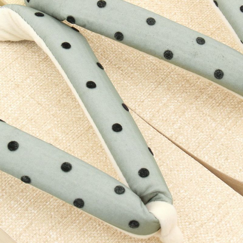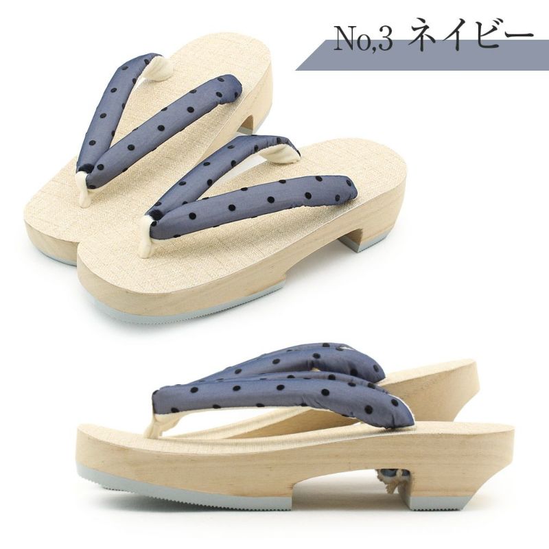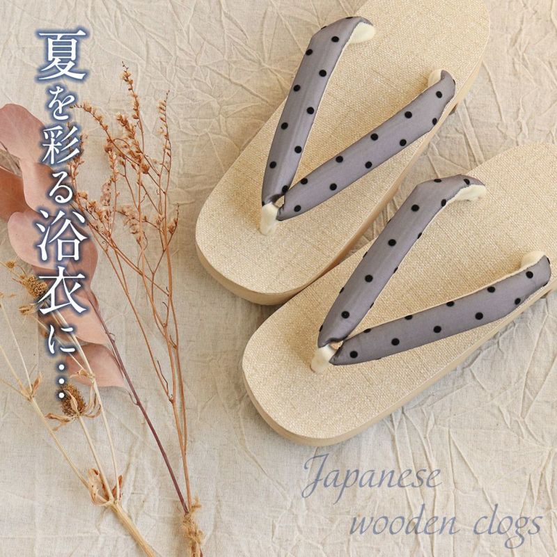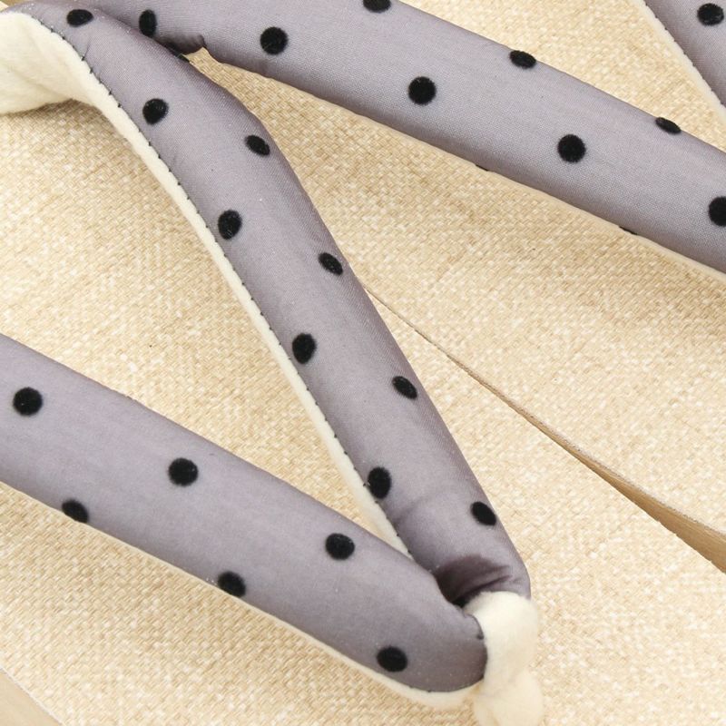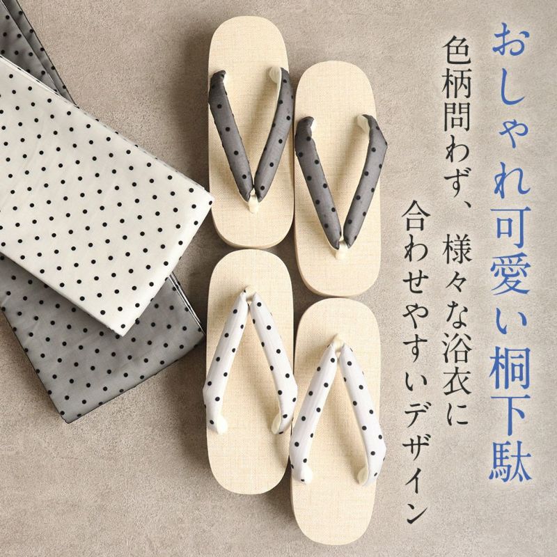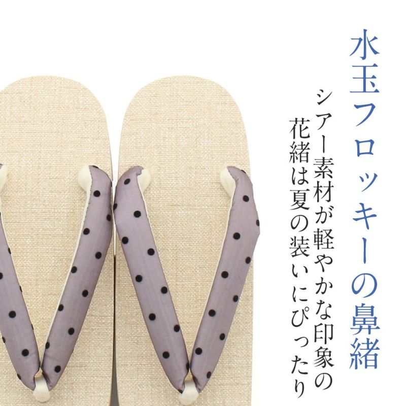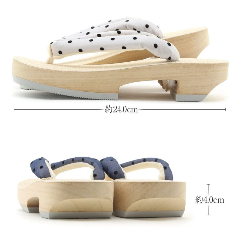 涼しげな白台の木目が美しい、水玉フロッキーレースを施した花緒を使用したお洒落桐下駄です。 レース花緒は、シアードット柄の透け感が可愛くアクセントになっています。 幅広の花緒は裏地の起毛素材がふんわりと柔らかで、足の甲をやさしく包み込みます。 麻のようなプリント張りが施された桐下駄は、サラリとして暑い日もベタつかず 心地よい履き心地。 裸足でご使用されても汚れにくくなっており 夏のお祭りや花火大会での浴衣や、カジュアルな夏着物にもお似合いです。 とても軽く水気に強い桐素材は程よい固さで足に馴染み、素敵な足音と歩く楽しさが感じられる逸品。 ヒールの高さは約4cmと程良い高さで歩きやすく、着姿も美しく見えます。 安心の日本製で、裏にはしっかりと滑り止めも付いておりますが、軽やかさは損なわず、夏の足元にピッタリ。 夏の浴衣はもちろんのこと、麻や綿のきもの、小紋や紬など、季節を問わず一年中楽しめる定番履物の日本製桐下駄です。 合わせやすい色合いの花緒で5色ご用意いたしました。お好みの下駄をお手元にとり履き心地をお楽しみ下さい。