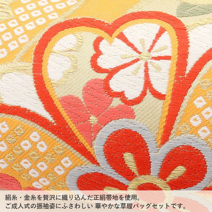 他の画像を見る ≪在庫限り≫ 成人式や結婚式の華やかな振袖に 成人式 草履バックセット 振袖 草履バッグセット 草履 バッグ 世美庵 4サイズ展開 S M L LLサイズ ゴールド 金 白 朱赤 華紋 花文 振袖用帯地 3枚芯 日本製 当店特別価格 ¥ 55,000 税込 お気に入りに登録する