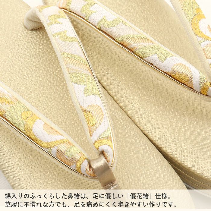 他の画像を見る 歩きやすい優花緒、初めての方にも安心の履き心地 草履バッグセット 成人式 振袖用 卒業袴 成人用 Sサイズ 金 ゴールド ホワイト 華紋 正絹帯地 2枚芯 優花緒 日本製 定価 ¥ 29,700 のところ 当店特別価格 ¥ 26,730 税込 カートに入れる お気に入りに登録する