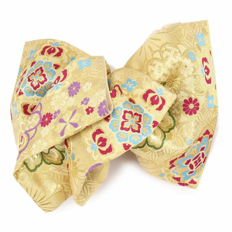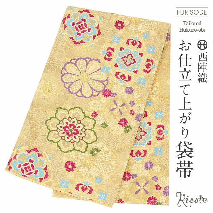 振袖にお使いいただける、西陣織お仕立て上り袋帯です。 華やかな色遣いの華紋などが帯全体を彩られており、晴れの日にピッタリのデザインです。 帯は伝統工芸の西陣織にて仕立てられており、染められた糸を複雑に織って模様を作るので、完成までに多数の工程があり、とても手間暇がかかる高級絹織物です。 こうして丁寧に織られた生地は、先染めしてから織っているので、一般的な染色法の後染めより丈夫でシワになりにくいのが特徴です。 正絹の帯には、金糸をふんだんに使用しており、魅入ってしまうほどの美しい輝きが魅力的。 光の当たり方で、絹の柔らかな光沢や金糸が反射し、豪華絢爛な帯がお楽しみいただけます。 絹の質感と光沢、大胆で鮮麗な柄が、大切なお祝いの席を華やかに演出してくれるでしょう。 結婚式やパーティーでの振袖はもちろん、一度きりの成人式に相応しい豪華な逸品です。