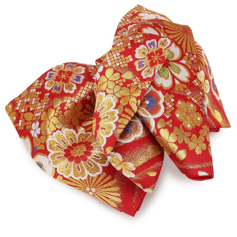 振袖にお使いいただける、西陣織お仕立て上り袋帯です。 華やかな色遣いの華紋や鹿の子などが帯全体を彩られており、晴れの日にピッタリのデザインです。 帯は伝統工芸の西陣織にて仕立てられており、染められた糸を複雑に織って模様を作るので、完成までに多数の工程があり、とても手間暇がかかる高級絹織物です。 こうして丁寧に織られた生地は、先染めしてから織っているので、一般的な染色法の後染めより丈夫でシワになりにくいのが特徴です。 正絹の帯には、金糸をふんだんに使用しており、魅入ってしまうほどの美しい輝きが魅力的。 光の当たり方で、絹の柔らかな光沢や金糸が反射し、豪華絢爛な帯がお楽しみいただけます。 絹の質感と光沢、大胆で鮮麗な柄が、大切なお祝いの席を華やかに演出してくれるでしょう。 結婚式やパーティーでの振袖はもちろん、一度きりの成人式に相応しい豪華な逸品です。