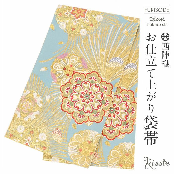 振袖にお使いいただける、西陣織お仕立て上り袋帯です。 華やかな色遣いの華紋などが帯全体を彩られており、晴れの日にピッタリのデザインです。 帯は伝統工芸の西陣織にて仕立てられており、染められた糸を複雑に織って模様を作るので、完成までに多数の工程があり、とても手間暇がかかる高級絹織物です。 こうして丁寧に織られた生地は、先染めしてから織っているので、一般的な染色法の後染めより丈夫でシワになりにくいのが特徴です。 正絹の帯には、金糸をふんだんに使用しており、魅入ってしまうほどの美しい輝きが魅力的。 光の当たり方で、絹の柔らかな光沢や金糸が反射し、豪華絢爛な帯がお楽しみいただけます。 絹の質感と光沢、大胆で鮮麗な柄が、大切なお祝いの席を華やかに演出してくれるでしょう。 結婚式やパーティーでの振袖はもちろん、一度きりの成人式に相応しい豪華な逸品です。