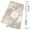 成人式や結婚式、振袖にお使いいただける、西陣織お仕立て上り袋帯です。 上品なグレージュカラーに雪輪・華紋・牡丹などの文様が織り込まれており、その繊細なデザインが目を引きます。 特に金糸と銀糸を使った緻密な織りは、帯全体に豪華で上品な輝きを与えています。 また牡丹の花びらにはモール糸が使用されており、帯全体に深みと高級感を加え、振袖とのコーディネートをさらに際立たせます。 王道のスタイルからレトロ、モダンスタイルまで合わせやすく、様々なコーディネートがお楽しみいただけます。 帯は伝統工芸の西陣織にて仕立てられており、染められた糸を複雑に織って模様を作るので、完成までに多数の工程があり、とても手間暇がかかる高級絹織物です。 こうして丁寧に織られた生地は、先染めしてから織っているので、一般的な染色法の後染めより丈夫でシワになりにくいのが特徴です。 綿密に織られた西陣織は糸数も多く、ぐっと締まって緩みにくいので、着姿もしゃんと背筋が伸びます。 絹の帯には、金銀糸などをふんだんに使用しており、魅入ってしまうほどの美しい輝きが魅力的。 光の当たり方で、絹特有の柔らかな光沢や金銀糸が反射し、高級感あふれる美しい帯がお楽しみいただけます。 絹の質感と光沢、大胆で鮮麗な柄が、大切なお祝いの席を華やかに演出してくれるでしょう。 結婚式やパーティーでの振袖はもちろん、一度きりの成人式に相応しい豪華な逸品です。