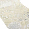 成人式や結婚式、振袖にお使いいただける、西陣織お仕立て上り袋帯です。 シャンパンゴールドの気品ある地色に、七宝や華紋が繊細に織り出され、金銀糸の輝きが晴れの日の装いを優美に彩ります。 煌びやかな光沢が上品に映え、華やかさの中に落ち着きを感じさせる一本です。 王道のスタイルからレトロ、モダンスタイルまで合わせやすく、様々なコーディネートがお楽しみいただけます。 帯は伝統工芸の西陣織にて仕立てられており、染められた糸を複雑に織って模様を作るので、完成までに多数の工程があり、とても手間暇がかかる高級絹織物です。 こうして丁寧に織られた生地は、先染めしてから織っているので、一般的な染色法の後染めより丈夫でシワになりにくいのが特徴です。 綿密に織られた西陣織は糸数も多く、ぐっと締まって緩みにくいので、着姿もしゃんと背筋が伸びます。 絹の帯には、金銀糸をふんだんに使用しており、魅入ってしまうほどの美しい輝きが魅力的。 光の当たり方で、絹特有の柔らかな光沢や金銀糸が反射し、高級感あふれる美しい帯がお楽しみいただけます。 絹の質感と光沢、大胆で鮮麗な柄が、大切なお祝いの席を華やかに演出してくれるでしょう。 成人式や結婚式、格式ある席にふさわしい、洗練の西陣織袋帯です。