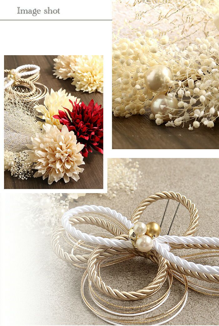 飾り部分のサイズ 約10cm×14cm(ロープ水引) 約7.5cm×7.5cm(花×3) 約8cm×13cm(チュール) 約3.5cm×4.5cm(かすみ草×2) Uピン本体 縦:約5.5cm 横 :約 1.0cm ※職人による手作りのため、同じ商品でも大きさに若干の違いがございます。