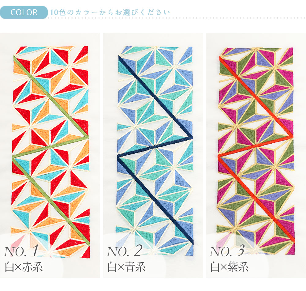 幾何学模様のような麻の葉をカラフルに刺繍であしらった半襟です。