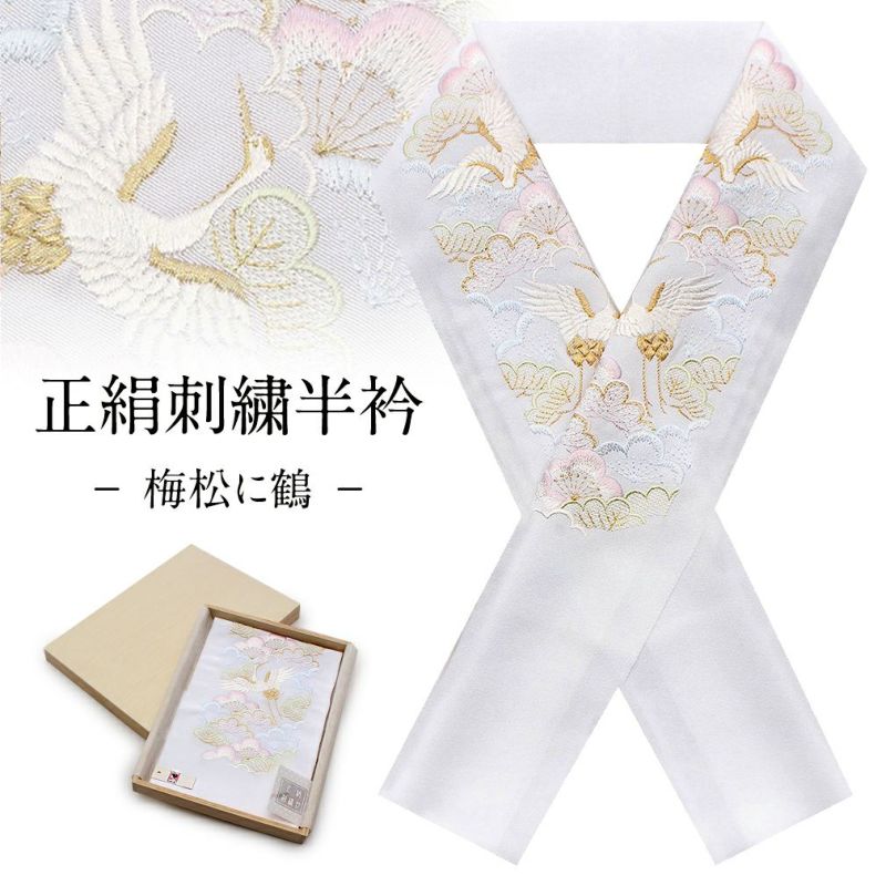 襟元を華やかに彩る、格調高い正絹刺繍半衿です。 しっとりと重みのある塩瀬生地は、上等な厚みが手触りから感じられる逸品。 清らかな白地をベースに、梅の花や松、鶴などの縁起の良い紋様を豪華にあしらった上品な半襟です。 一段と目を引く鶴は金糸が輝き、淡い色合いの梅と松が全体を艶やかに彩る煌びやかな仕上がりとなっております。 刺繍をふんだんに施している為、ふっくらとした生地感です。 程よいボリューム感がある衿元は、お着物の格を高める効果が期待されます。 専用の桐箱に入れてお届けいたします。 華やかな帯や小物を合わせて、結婚式、披露宴、成人式、式典など、フォーマルな場面におすすめです。