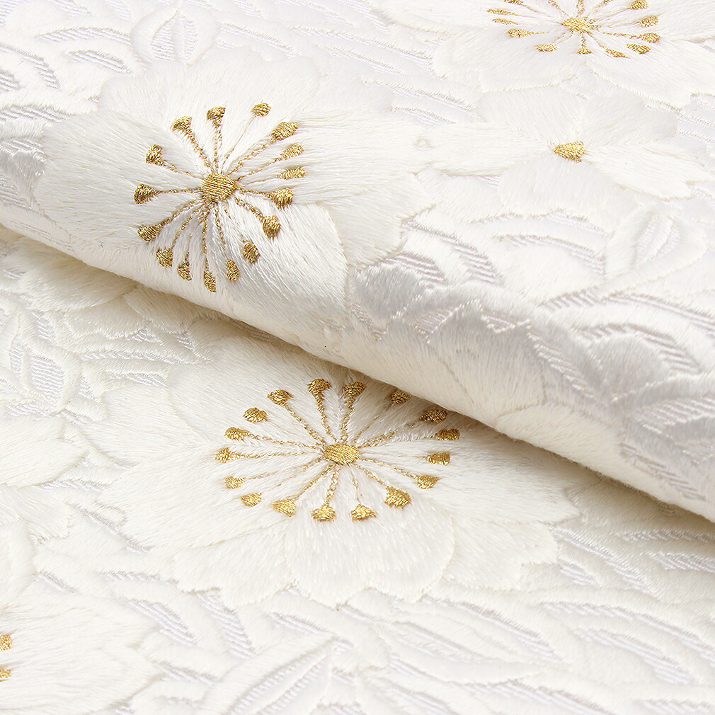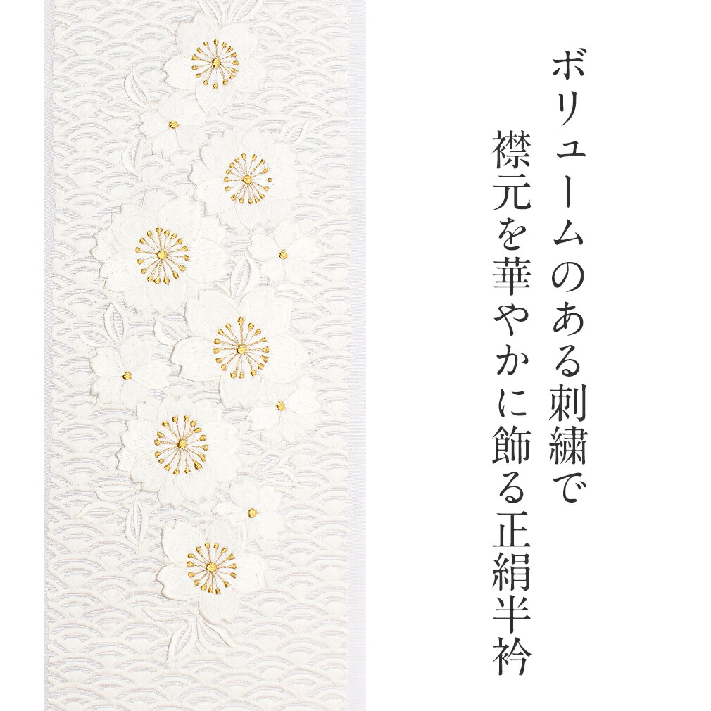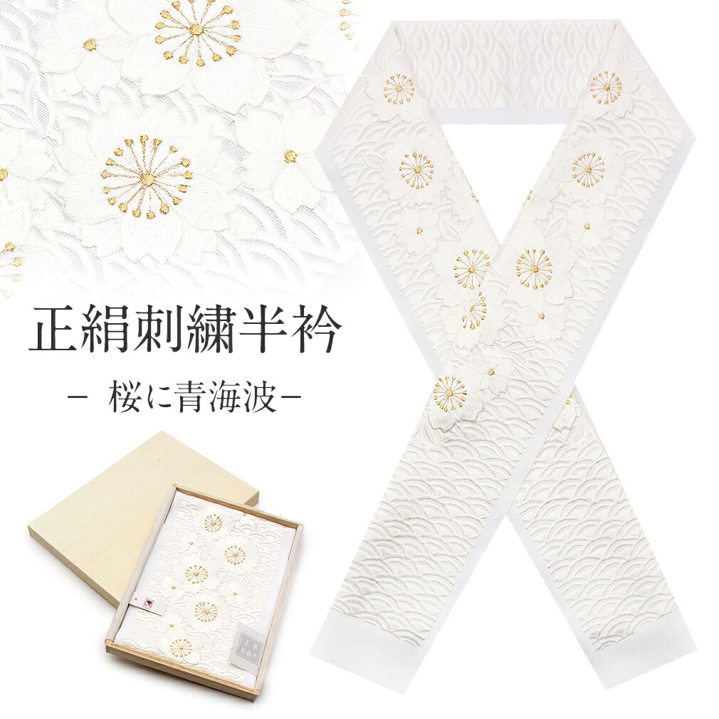 半襟 半衿 刺繍 振袖 成人式 白 ゴールド 桜に青海波 留袖 訪問着 礼装 正絹 日本製 桐箱入 結婚式 ブライダル 白無垢 卒業式 訪問着 留袖