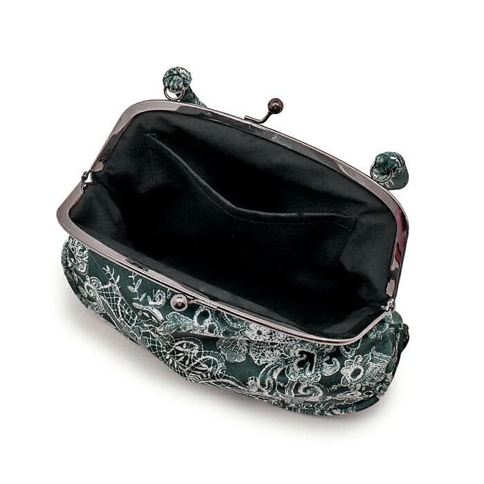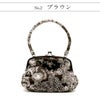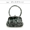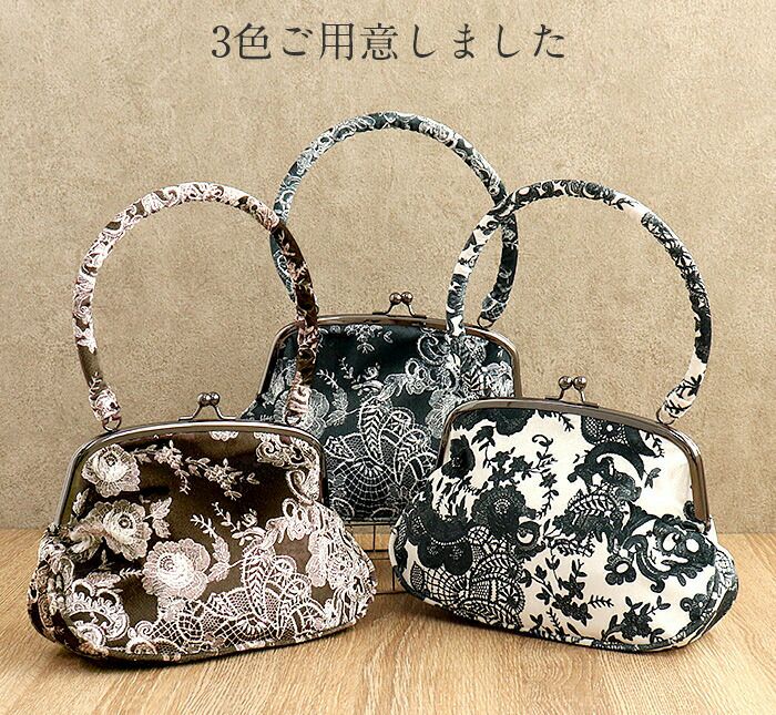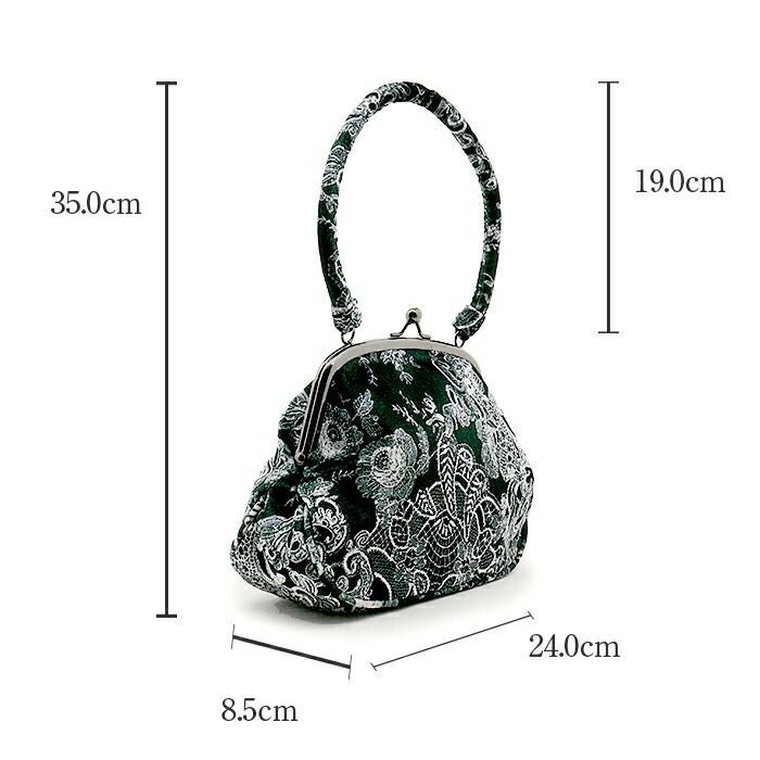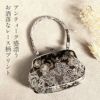 成人式や結婚式での振袖や卒業袴といった、華やかなおきものの装いに合わせていただけるがま口バッグです。 レース柄がプリントされた華やかなアンティーク調バッグです。 がま口タイプで大きく口が開くので中身が取り出せやすく、使い勝手も抜群!財布やスマホも楽に収納できます。 袴には昔ながらの巾着もステキですが、こんなお洒落バッグで楽しんでもいいですね。 お母様の振袖(ママ振り)やお姉様の振袖を受け継いで、バッグなどの小物を新調したコーディネートにするお嬢様も多くいらっしゃいます。 レンタルの振袖であったり譲りものの振袖をお召しの機会であっても一つでもこだわって選んだアイテムがあるとお慶びの席のご気分が高まりますし、レンタルではなかなか出回らない繊細なお作りやお洒落なデザインのがま口バッグは振袖コーデの中でもぱっと目を引く存在になるでしょう。 華やかな装いを楽しみたい日のおともに、ぜひお手に取っていただきたいがま口バッグです。