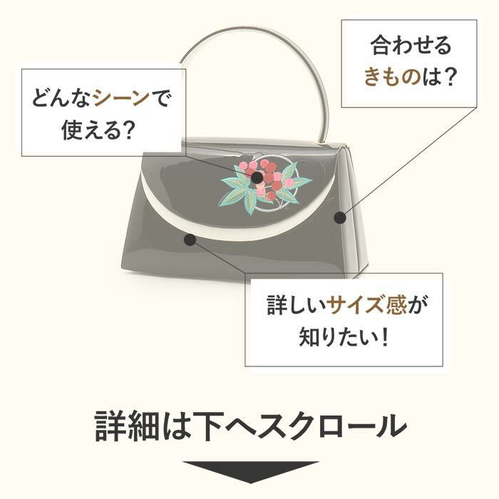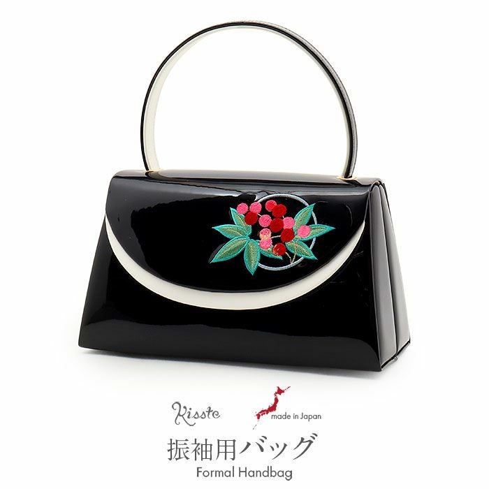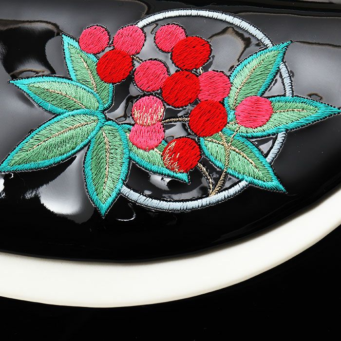 ◆艶めくエナメルに“南天の華”― 晴れの日を可愛く彩る振袖バッグ◆ つややかな黒エナメルに、鮮やかな南天の刺繍がふわりと映える、振袖スタイルにぴったりのフォーマルバッグです。 南天は「難を転ずる」といわれる縁起の良いモチーフ。 大切な日の装いに、華やぎを添えてくれます。 ――おすすめポイント―― ・南天の刺繍が可憐で縁起の良いアクセント ・艶感の美しいブラックエナメルで振袖に上品マッチ ・中は2室構造+各室に内ポケット付きで整頓しやすい ・丁寧な日本製の仕立て ・底鋲もついて、畳や机に置くときにバッグ本体を擦ってしまうのを防ぐことができます。 大切な晴れの日に、可愛らしさと上品さをそっと添えてくれる、振袖にぴったりのフォーマルバッグです。