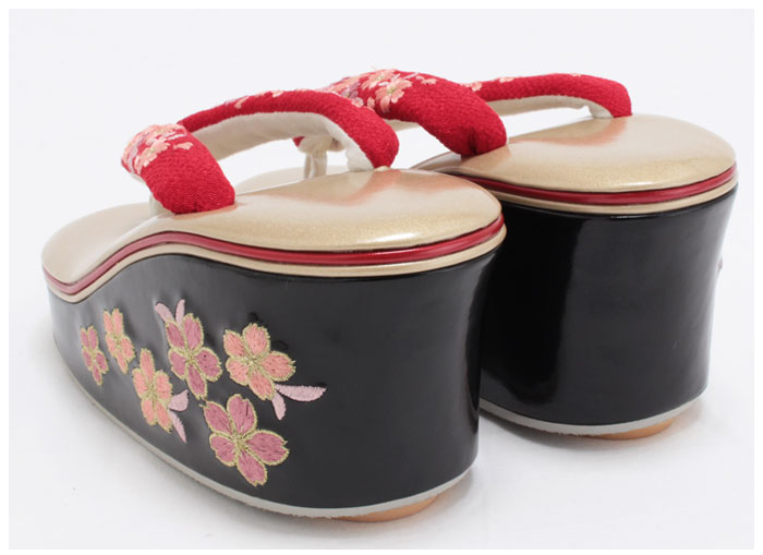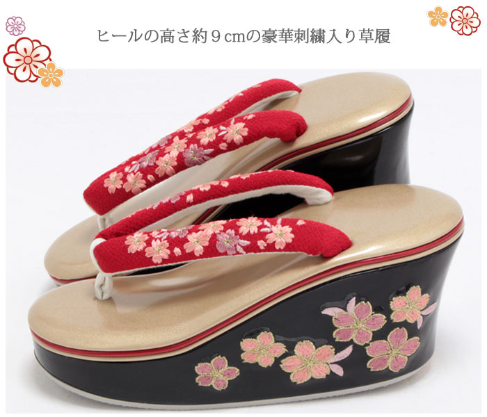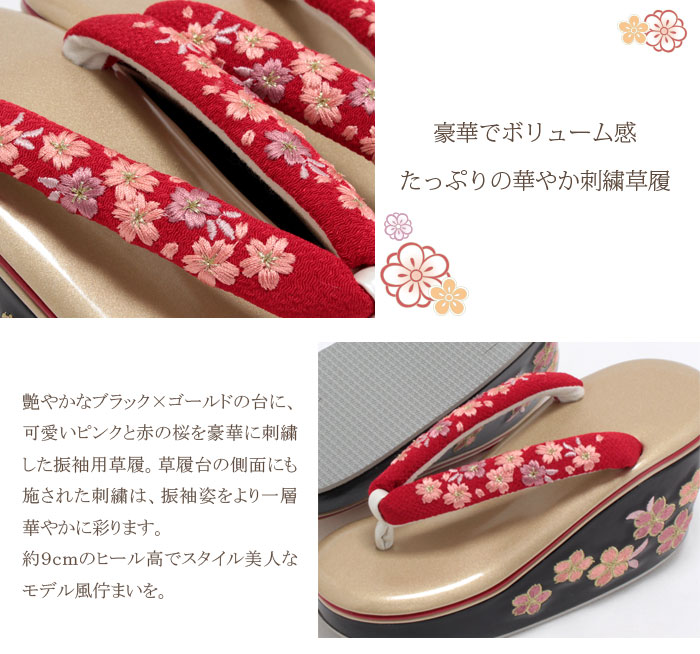 草履 成人式 振袖用 ハイヒール 厚底 Lサイズ フリーサイズ <ゴールド 黒 赤/桜 刺繍>