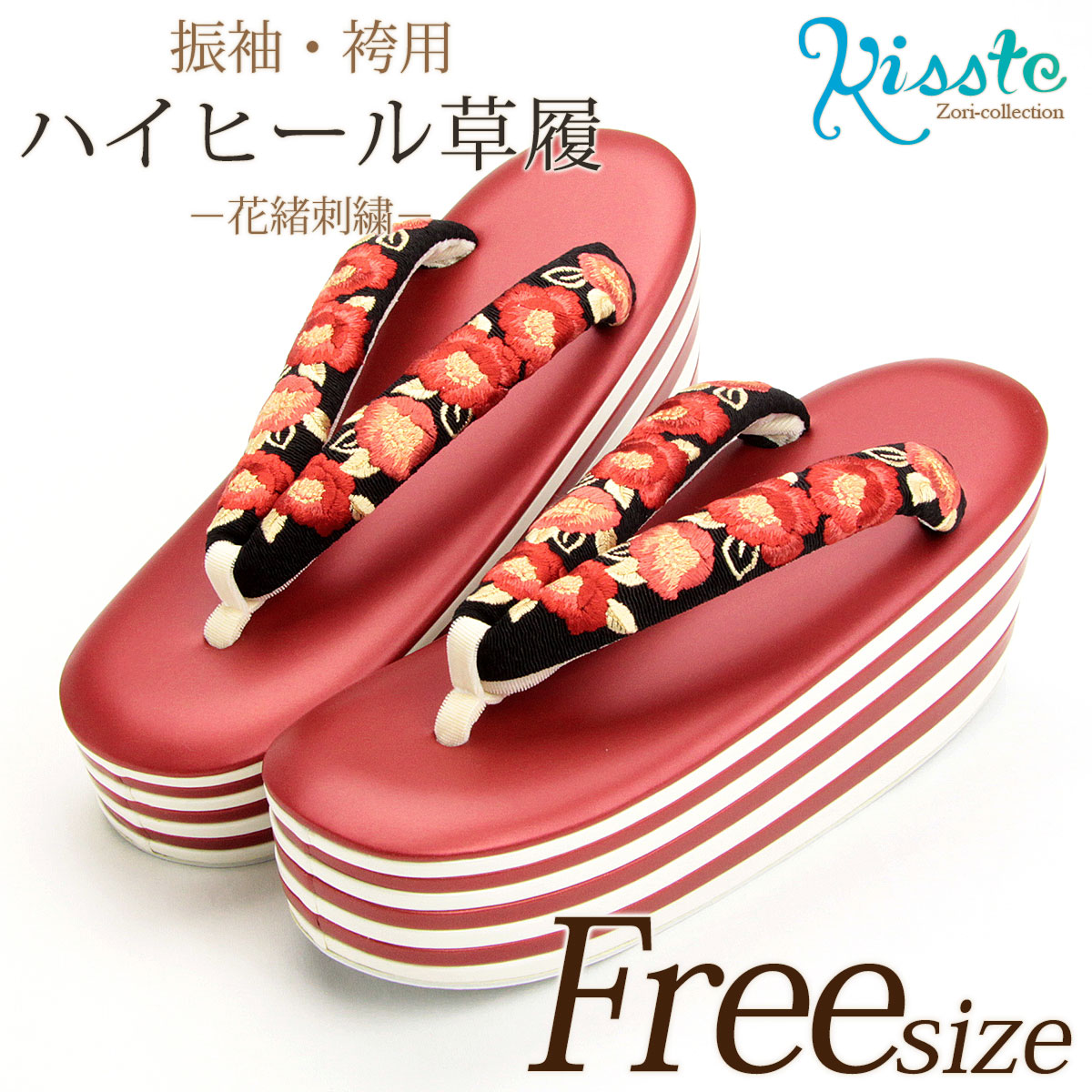 草履 成人式 振袖用 <ハイヒール> Lサイズ フリーサイズ 厚底 重ね<赤 白/牡丹 黒 刺繍>