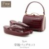 クロコダイル風エナメル素材を使用した草履バッグセットです。 シンプルでお洒落な草履バッグセットで振袖姿をより一層素敵に演出します。 バッグと同じ生地を使用した草履が統一感をプラスし、より豪華な佇まいに。 エナメル素材の2枚芯で、かかとの高さは約5.5cmと程よいヒール高です。 クッション加工が施されており歩きやすく、きもの初心者の方も履きやすくおすすめの草履です。 バッグの容量は小さめのお財布やデジカメなどが入る程良い大きさ。 成人式や結婚式の振袖をはじめ、謝恩会や卒業式など晴着スタイルにご利用いただけます。