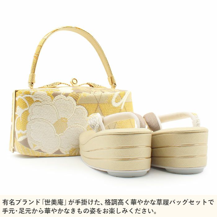 他の画像を見る 草履バッグセット 成人式 振袖用 <世美庵> Sサイズ Mサイズ Lサイズ LLサイズ 日本製 <ゴールド/吉祥紋> 日本製 正絹 当店特別価格 ¥ 52,800 税込 (0) お気に入りに登録する