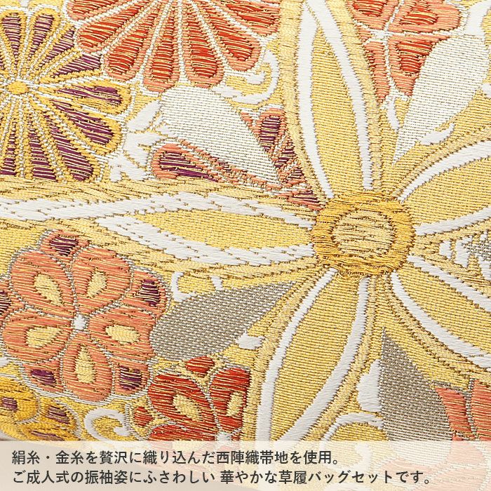 他の画像を見る 草履バッグセット 成人式 振袖用 <世美庵> Sサイズ Mサイズ Lサイズ LLサイズ 西陣袋帯地使用 3枚芯<ゴールド・シルバー/菊華紋> 当店特別価格 ¥ 55,000 税込 (0) カートに入れる お気に入りに登録する