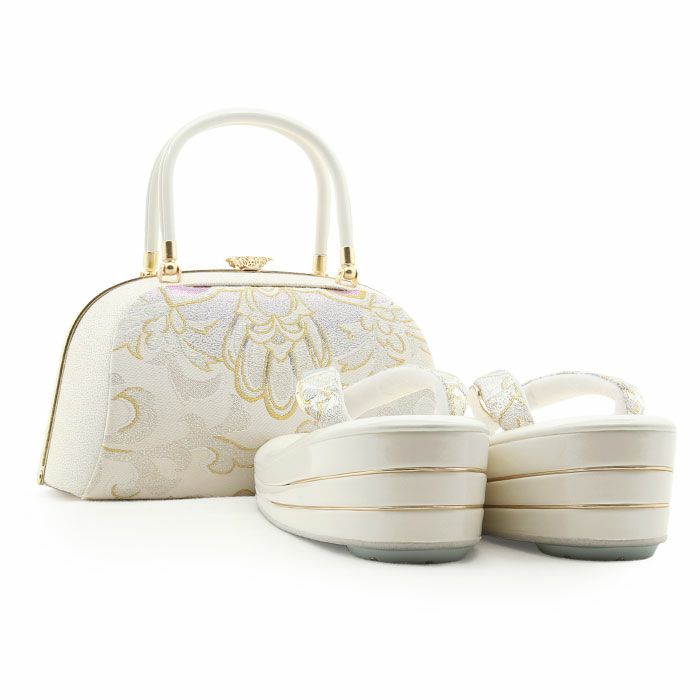 他の画像を見る ≪在庫限り≫ 成人式や結婚式の華やかな振袖に 成人式 草履バックセット 振袖 草履バッグセット 草履 バッグ 世美庵 華三彩 M シルバー アイボリー 灰 唐花模様 帯地 2枚芯 日本製 当店特別価格 ¥ 41,800 税込 お気に入りに登録する